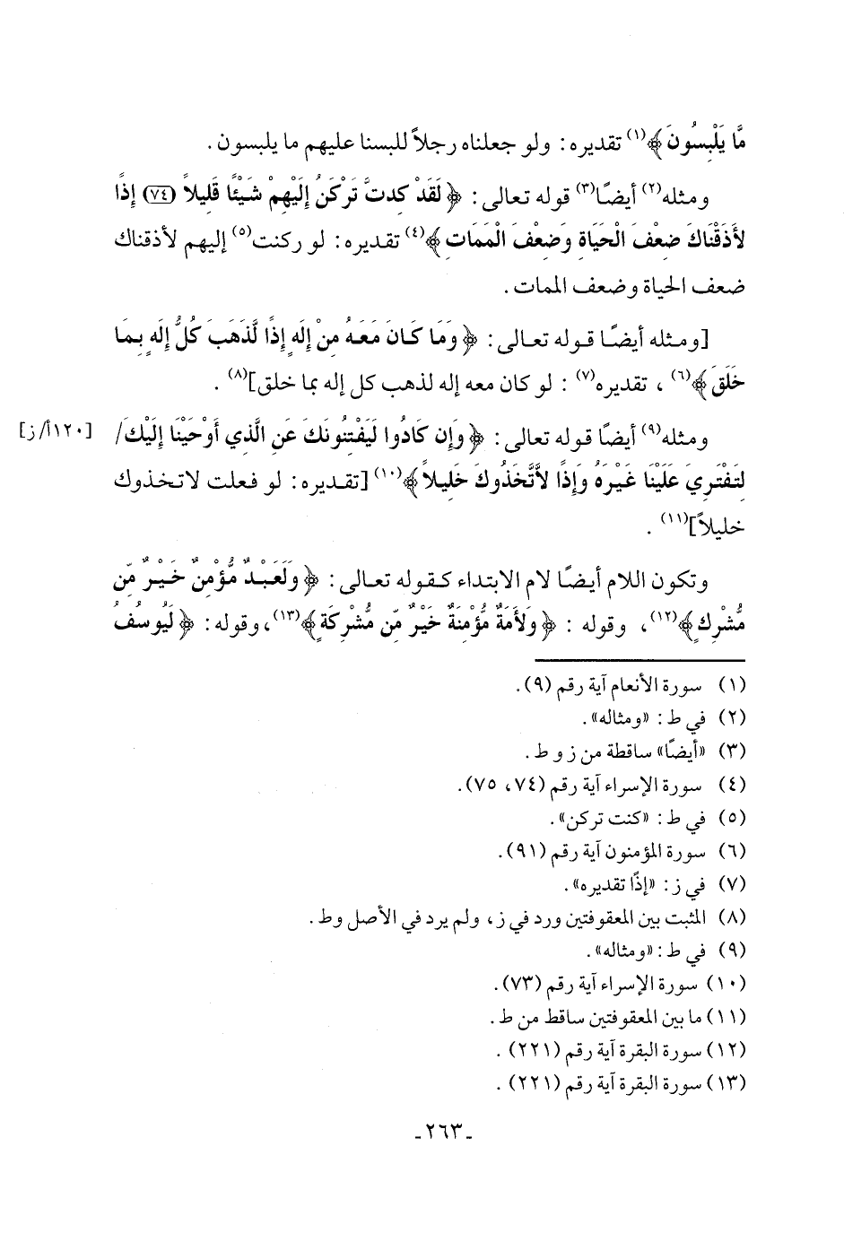 ومثله (¬2) أيضًا (¬3) قوله تعالى: {لَقَدْ كِدْتَ تَرْكَنُ إِلَيْهِمْ شَيْئًا قَلِيلًا (74) إِذًا لَأَذَقْنَاكَ ضِعْفَ الْحَيَاةِ وَضِعْفَ الْمَمَاتِ} (¬4) تقديره: لو ركنت (¬5) إليهم لأذقناك ضعف الحياة وضعف الممات.