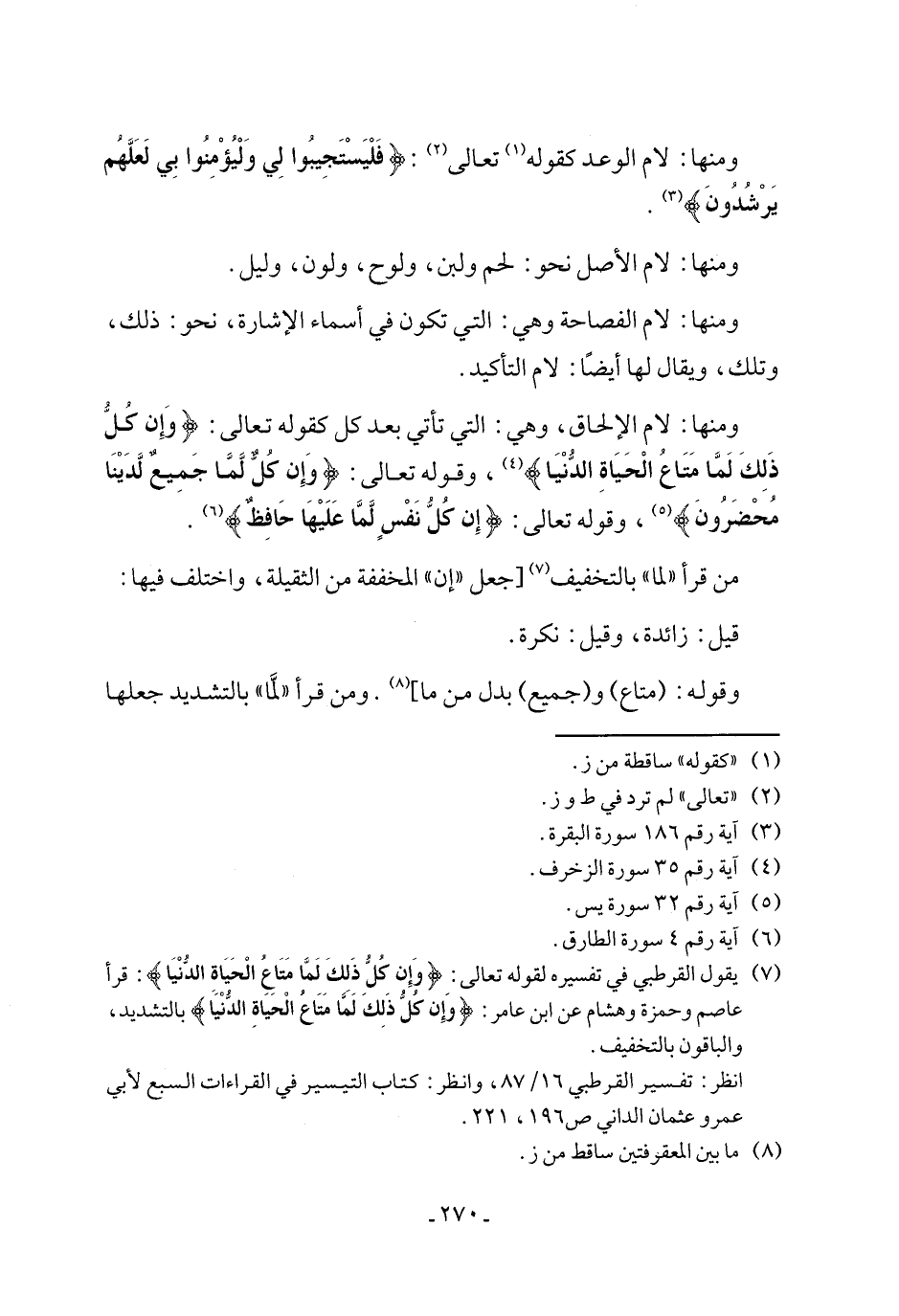 (¬7) يقول القرطبي في تفسيره لقوله تعالى: {وَإِن كُلُّ ذَلكَ لَمَّا مَتَاعُ الْحَيَاة الدُّنْيَا}: قرأ عاصم وحمزة وهشام عن ابن عامر: {وَإِن كُلُّ ذَلِكَ لَمَّا مَتَاعُ الْحياةِ الدُّنْيَاَ} بالتشديد، والباقون بالتخفيف.