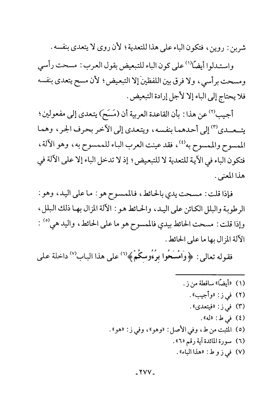 أجيب (¬2) عن هذا: بأن القاعدة العربية أن (مَسَح) يتعدى إلى مفعولين؛ يتعدى (¬3) إلى أحدهما بنفسه، ويتعدى إلى الآخر بحرف الجر، وهما الممسوح والممسوح به (¬4)، وقد عينت العرب الباء للممسوح به، وهو الآلة، فتكون الباء في الآية للتعدية لا للتبعيض؛ إذ لا تدخل الباء إلا على الآلة في هذا المعنى.