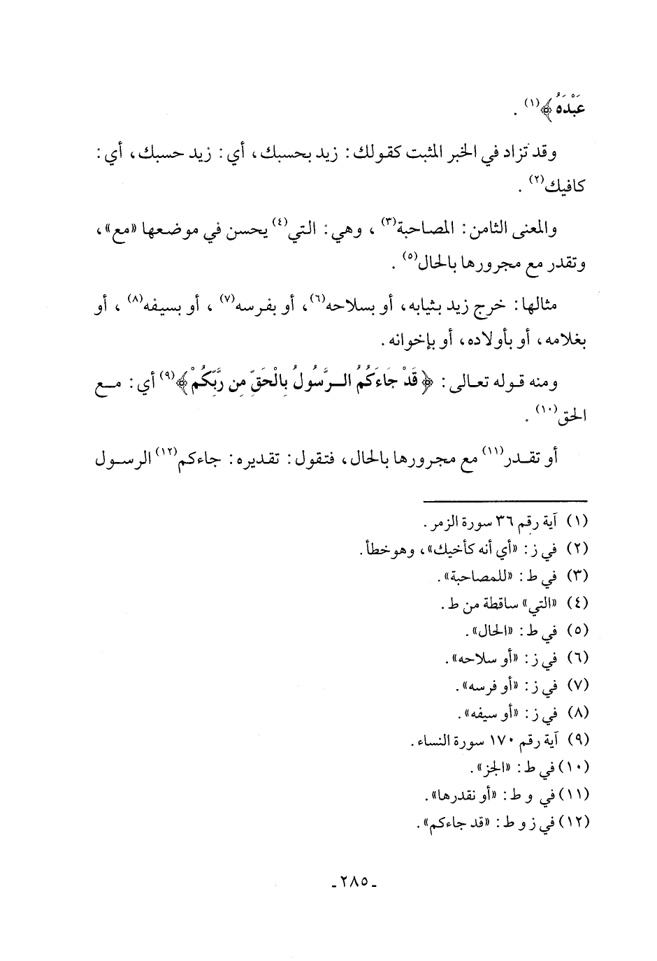 أو تقدر (¬11) مع مجرورها بالحال، فتقول: تقديره: جاءكم (¬12) الرسول