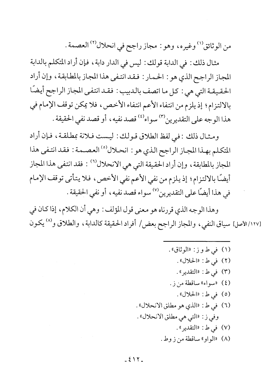 ومثال ذلك: في لفظ الطلاق قولك: ليست فلانة بمطلقة، فإن أراد المتكلم بهذا المجاز الراجح الذي هو: انحلال (¬5) العصمة: فقد انتفى هذا المجاز بالمطابقة، وإن أراد الحقيقة التي هي الانحلال (¬6): فقد انتفى هذا المجاز أيضًا بالالتزام؛ إذ يلزم من نفي الأعم نفي الأخص، فلا يتأتى توقف الإمام في هذا أيضًا على التقديرين (¬7) سواء قصد نفيه، أو نفي الحقيقة.