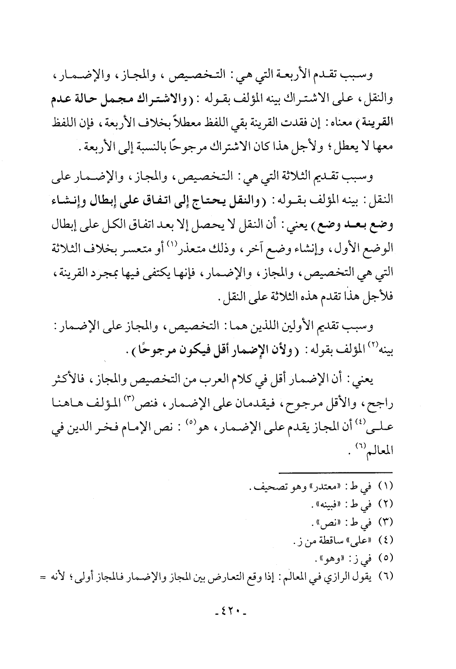 (¬6) يقول الرازي في المعالم: إذا وقع التعارض بين المجاز والإضمار فالمجاز أولى؛ لأنه =