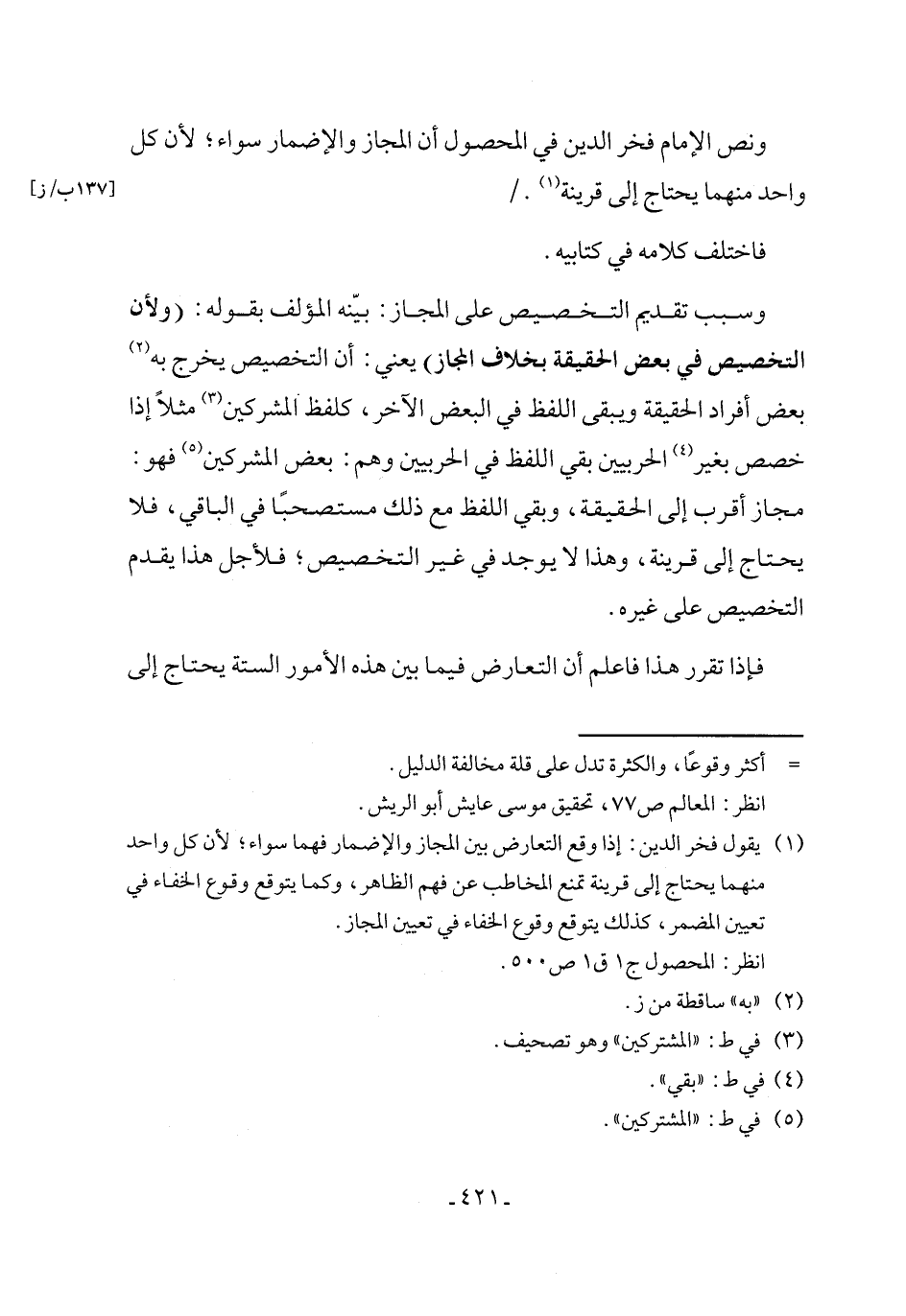 (¬1) يقول فخر الدين: إذا وقع التعارض بين المجاز والإضمار فهما سواء؛ لأن كل واحد منهما يحتاج إلى قرينة تمنع المخاطب عن فهم الظاهر، وكما يتوقع وقوع الخفاء في تعيين المضمر، كذلك يتوقع وقوع الخفاء في تعيين المجاز.