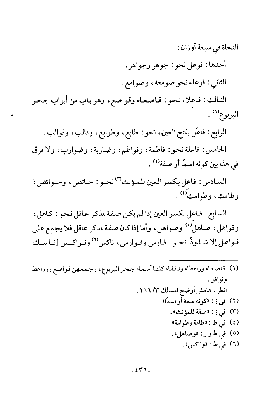 السادس: فاعل بكسر العين للمؤنث (¬3) نحو: حائض، وحوائض، وطامث، وطوامثَ (¬4).