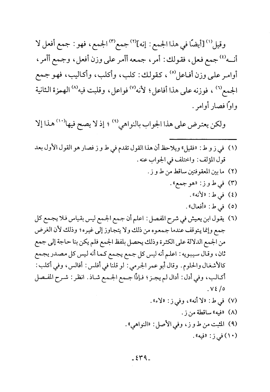 وقيل (¬1) [أيضًا في هذا الجمع: إنه] (¬2) جمع (¬3) الجمع، فهو: جمع أفعل لا أنه (¬4) جمع فعل، فقولك: أمر، جمعه أأمر على وزن أفعل، وجمع أأمر، أوامر على وزن أفاعل (¬5)، كقولك: كلب، وأكلب، وأكاليب، فهو جمع الجمع (¬6)، فوزنه على هذا أفاعل؛ لأنه (¬7) فواعل، وقلبت فيه (¬8) الهمزة الثانية واوًا فصار أوامر.