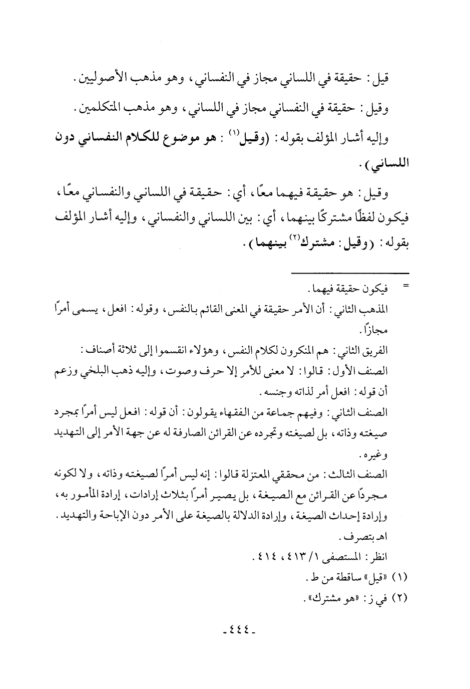 وقيل: حقيقة في النفساني مجاز في اللساني، وهو مذهب المتكلمين.