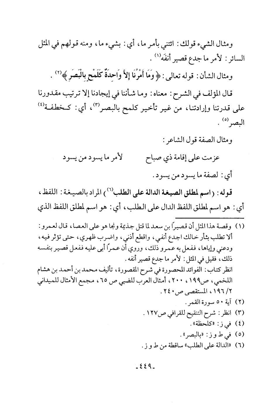 ومثال الشيء قولك: ائتني بأمر ما، أي: بشيء ما، ومنه قولهم في المثل السائر: لأمر ما جدع قصير أنفَه (¬1).