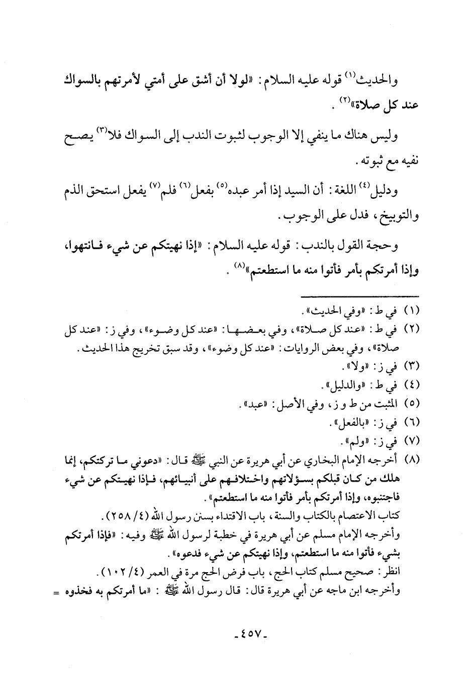 (¬8) أخرجه الإمام البخاري عن أبي هريرة عن النبي - صلى الله عليه وسلم - قال: "دعوني ما تركتكم، إنما هلك من كان قبلكم بسؤلاتهم واختلافهم على أنبيائهم، فإذا نهيتكم عن شيء فاجتنبوه, وإذا أمرتكم بأمر فأتوا منه ما استطعتم".
