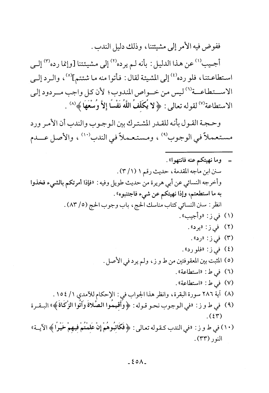 أجيب (¬1) عن هذا الدليل: بأنه لم يرده (¬2) إلى مشيئتنا [وإنما رده (¬3) إلى استطاعتنا، فلو رده (¬4) إلى المشيئة لقال: فأتوا منه ما شئتم] (¬5)، والرد إلى الاستطاعة (¬6) ليس من خواص المندوب؛ لأن كل واجب مردود إلى الاستطاعة (¬7) لقوله تعالى: {لا يُكَلِّفُ اللَّهُ نَفْسًا إلا وُسْعَهَا} (¬8).