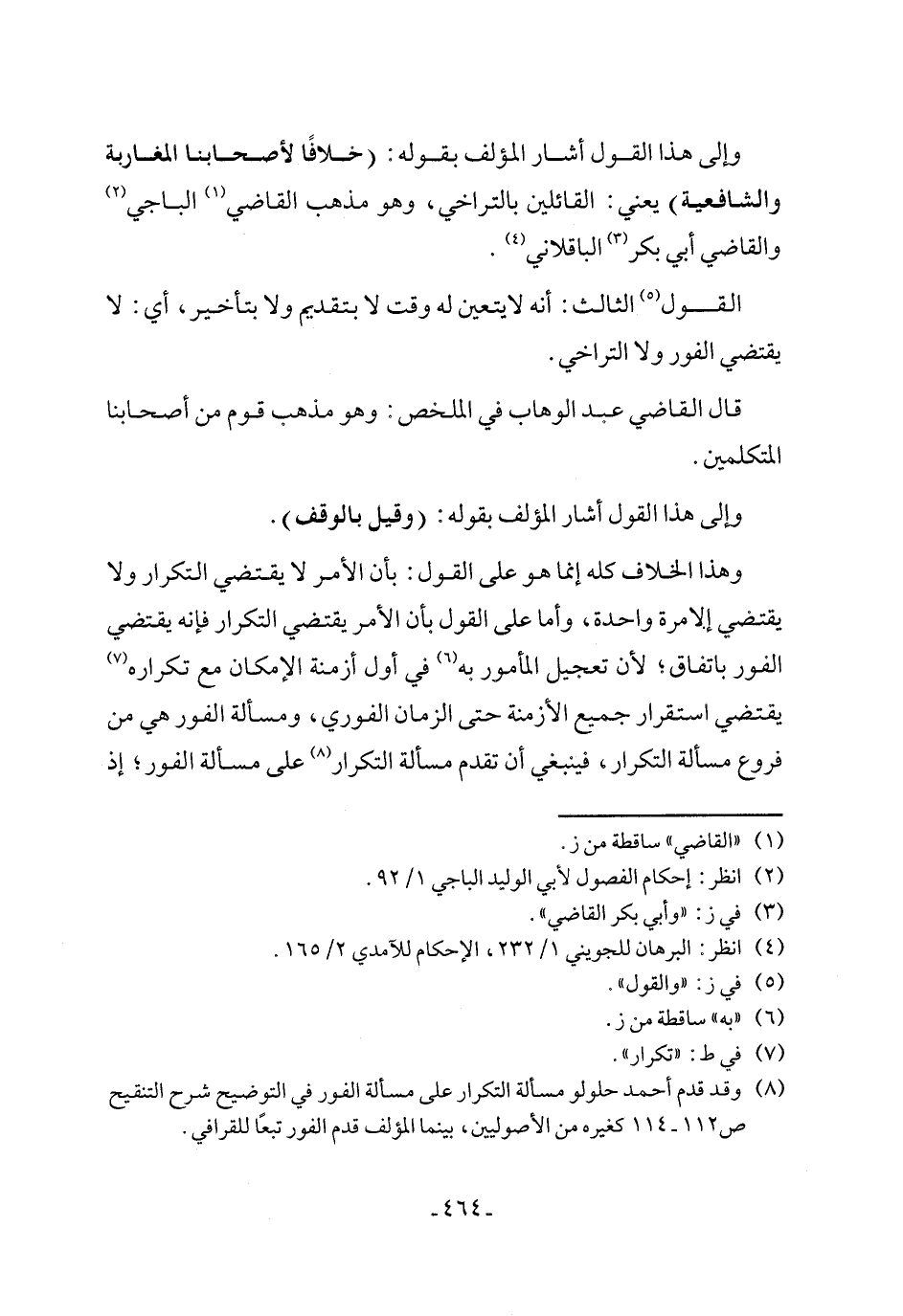 (¬8) وقد قدم أحمد حلولو مسألة التكرار على مسألة الفور في التوضيح شرح التنقيح ص 112 - 114 كغيره من الأصوليين، بينما المؤلف قدم الفور تبعًا للقرافي.