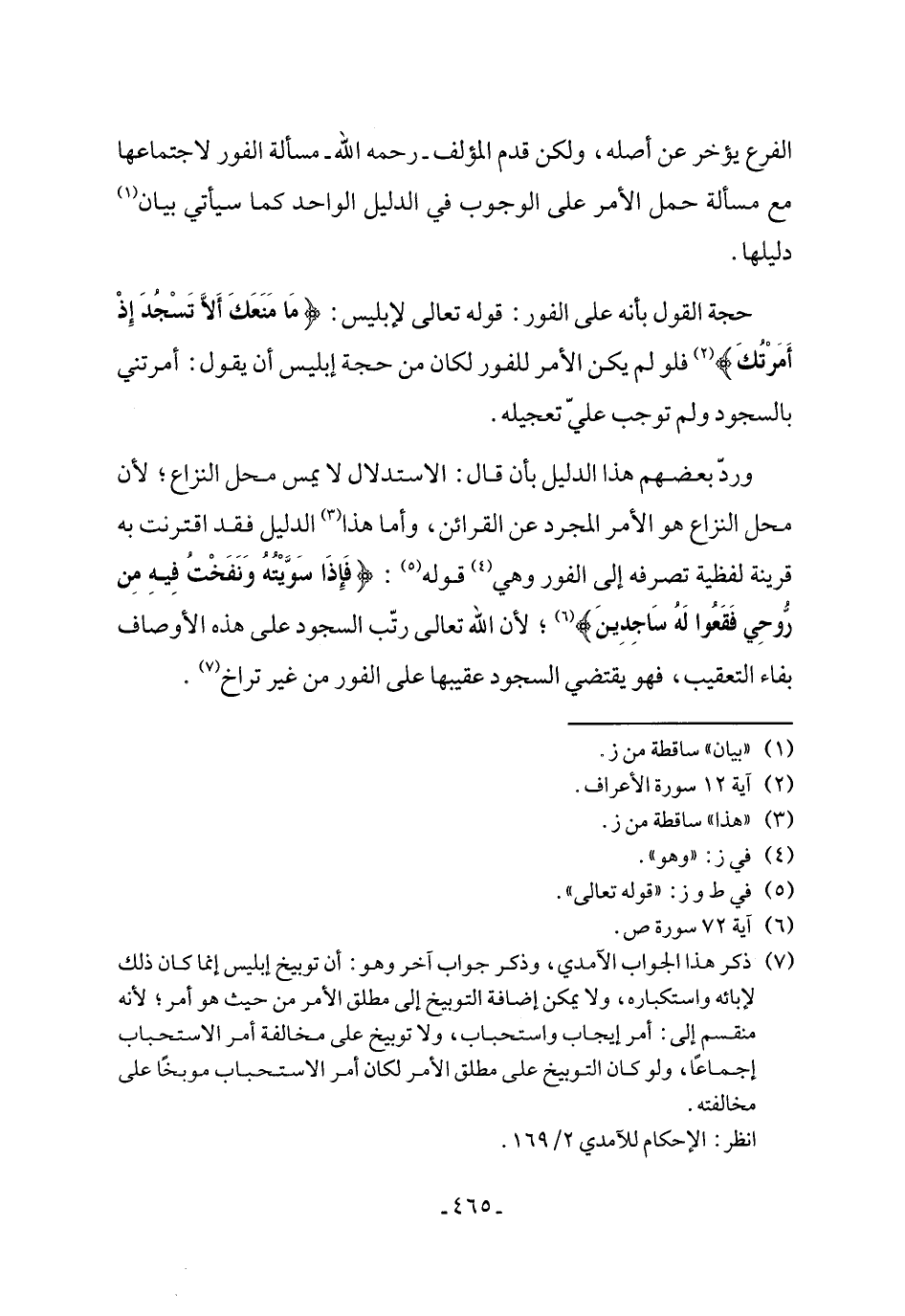 وردّ بعضهم هذا الدليل بأن قال: الاستدلال لا يمس محل النزاع؛ لأن محل النزاع هو الأمر المجرد عن القرائن، وأما هذا (¬3) الدليل فقد اقترنت به قرينة لفظية تصرفه إلى الفور وهي (¬4) قوله (¬5): {فَإِذَا سَوَّيْتُهُ وَنَفَخْتُ فِيهِ مِن رُّوحِي فَقَعُوا لَهُ سَاجِدِينَ} (¬6)؛ لأن الله تعالى رتّب السجود على هذه الأوصاف بفاء التعقيب، فهو يقتضي السجود عقيبها على الفور من غير تراخ (¬7).