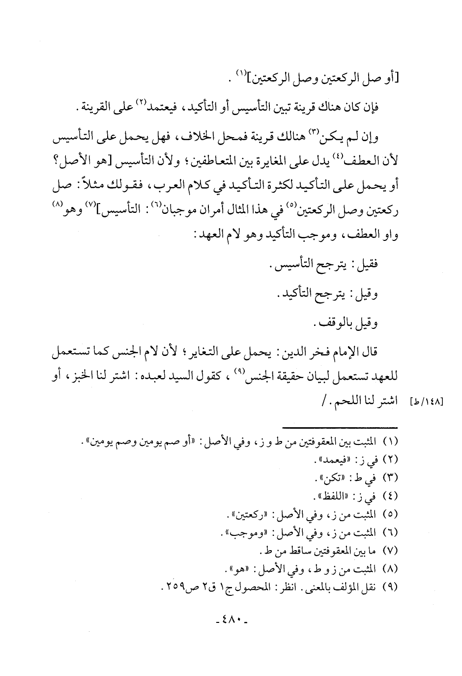 وإن لم يكن (¬3) هنالك قرينة فمحل الخلاف، فهل يحمل على التأسيس لأن العطف (¬4) يدل على المغايرة بين المتعاطفين؛ ولأن التأسيس [هو الأصل؟ أو يحمل على التأكيد لكثرة التأكيد في كلام العرب، فقولك مثلاً: صل ركعتين وصل الركعتين (¬5) في هذا المثال أمران موجبان (¬6): التأسيس] (¬7) وهو (¬8) واو العطف، وموجب التأكيد وهو لام العهد: