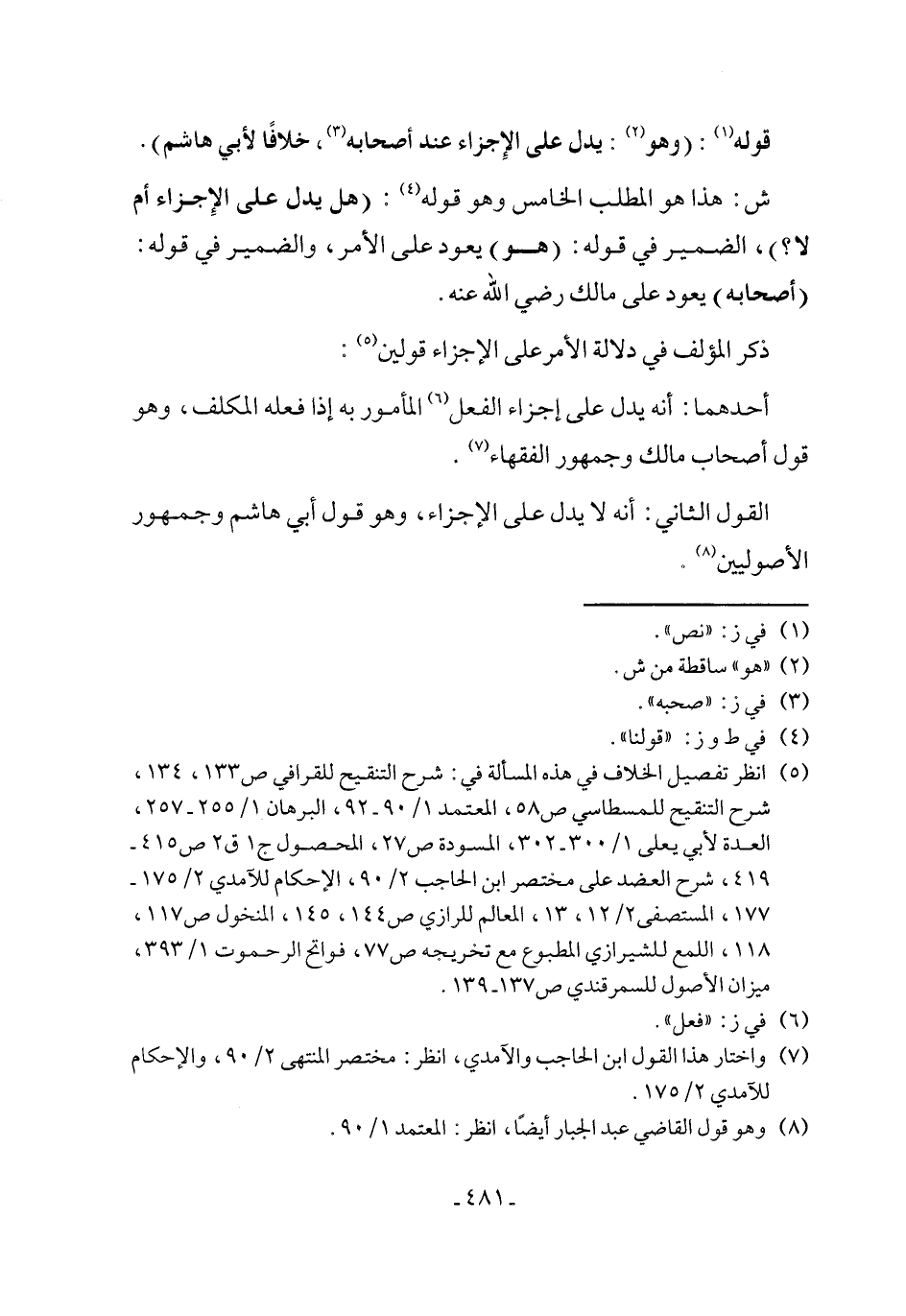 ش: هذا هو المطلب الخامس وهو قوله (¬4): (هل يدل على الإِجزاء أم لا؟)، الضمير في قوله: (هو) يعود على الأمر، والضمير في قوله: (أصحابه) يعود على مالك رضي الله عنه.