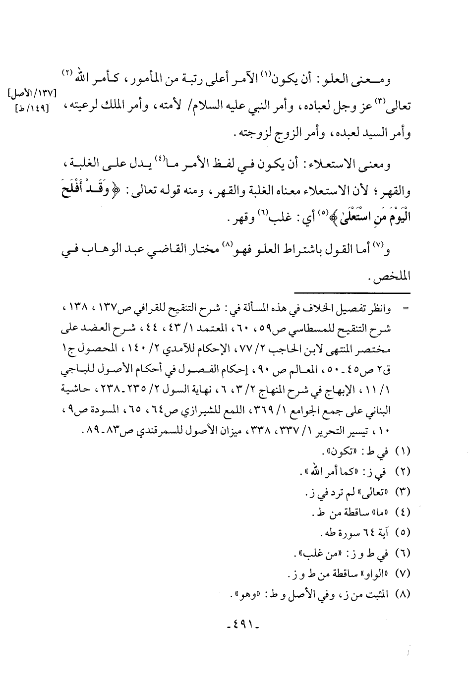 ومعنى الاستعلاء: أن يكون في لفظ الأمر ما (¬4) يدل على الغلبة، والقهر؛ لأن الاستعلاء معناه الغلبة والقهر، ومنه قوله تعالى: {وَقَدْ أَفْلَحَ الْيَوْمَ مَنِ اسْتَعْلَى} (¬5) أي: غلب (¬6) وقهر.