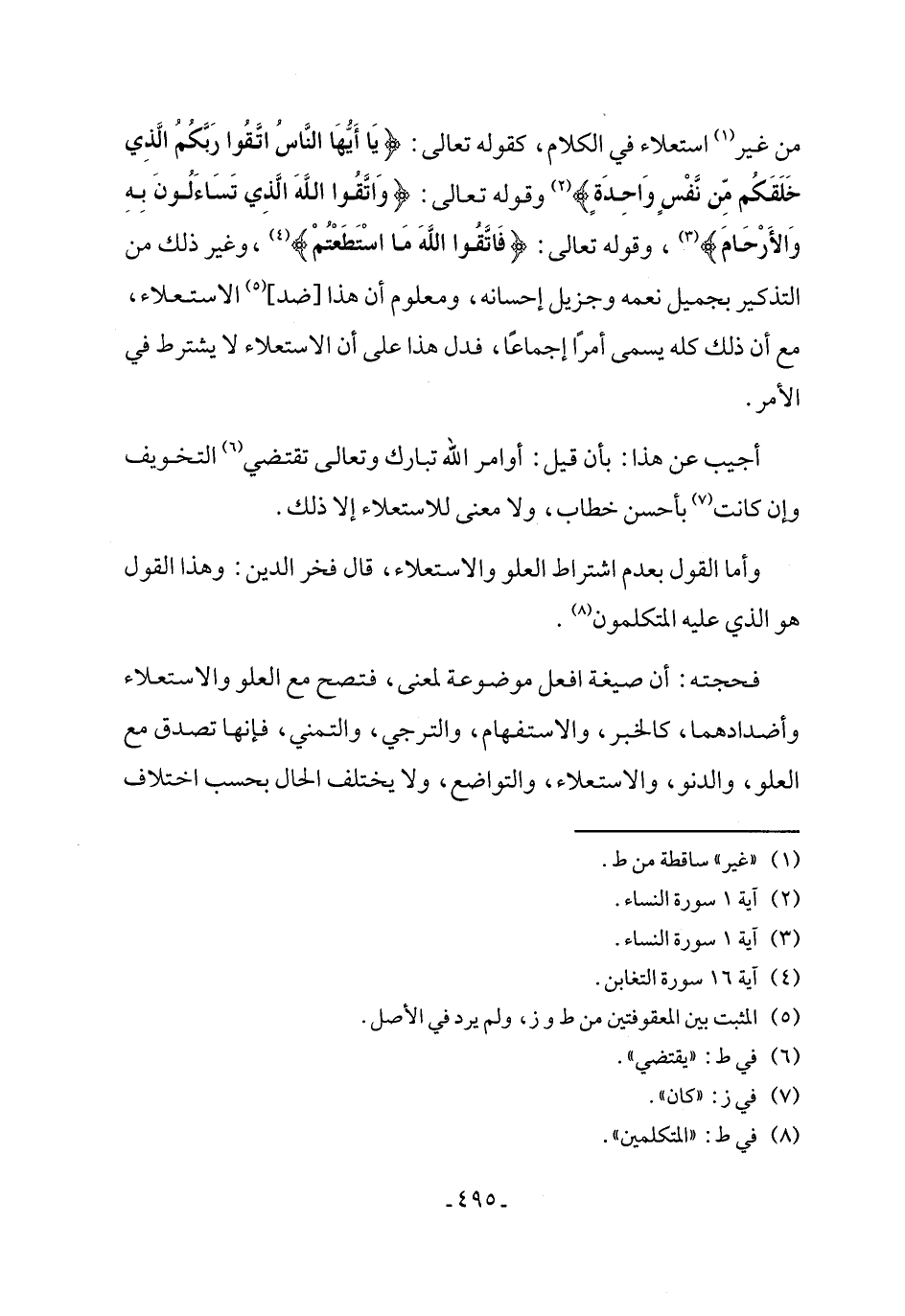 من غير (¬1) استعلاء في الكلام، كقوله تعالى: {يَاأَيُّهَا النَّاسُ اتَّقُوا رَبَّكُمُ الَّذِي خَلَقَكُمْ مِنْ نَفْسٍ وَاحِدَةٍ} (¬2) وقوله تعالى: {وَاتَّقُوا اللَّهَ الَّذِي تَسَاءَلُونَ بِهِ وَالأَرْحَامَ} (¬3)، وقوله تعالى: {فَاتَّقُوا اللَّهَ مَا اسْتَطَعْتُمْ} (¬4)، وغير ذلك من التذكير بجميل نعمه وجزيل إحسانه، ومعلوم أن هذا [ضد] (¬5) الاستعلاء، مع أن ذلك كله يسمى أمرًا إجماعًا، فدل هذا على أن الاستعلاء لا يشترط في الأمر.