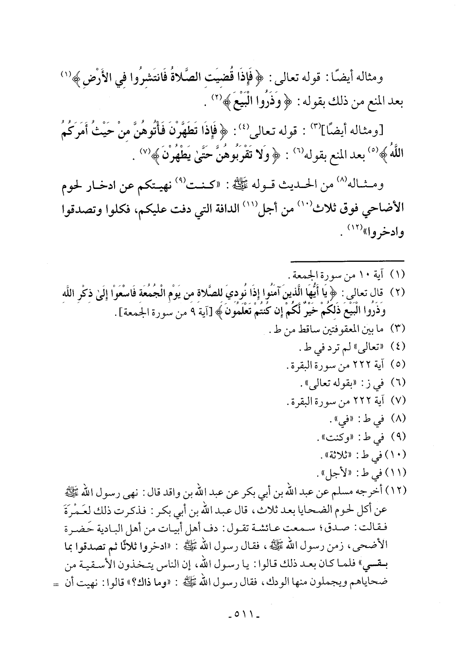 (¬12) أخرجه مسلم عن عبد الله بن أبي بكر عن عبد الله بن واقد قال: نهى رسول الله - صلى الله عليه وسلم - عن أكل لحوم الضحايا بعد ثلاث، قال عبد الله بن أبي بكر: فذكرت ذلك لعَمْرَةَ فقالت: صدق؛ سمعت عائشة تقول: دف أهل أبيات من أهل البادية حضرة الأضحى، زمن رسول الله - صلى الله عليه وسلم -، فقال رسول الله - صلى الله عليه وسلم -: "ادخروا ثلاثًا ثم تصدقوا بما بقي" فلما كان بعد ذلك قالوا: يا رسول الله، إن الناس يتخذون الأسقية من ضحاياهم ويجملون منها الودك، فقال رسول الله - صلى الله عليه وسلم -: "وما ذاك؟ " قالوا: نهيت أن =