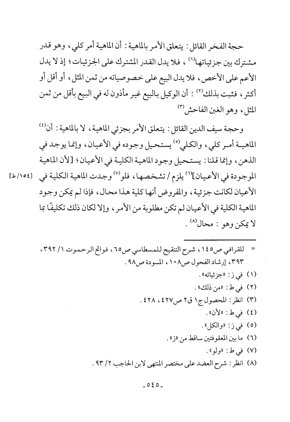 وحجة سيف الدين القائل: يتعلق الأمر بجزئي الماهية، لا بالماهية: أن (¬4) الماهية أمر كلي، والكلي (¬5) يستحيل وجوده في الأعيان، وإنما يوجد في الذهن، وإنما قلنا: يستحيل وجود الماهية الكلية في الأعيان؛ [لأن الماهية الموجودة في الأعيان] (¬6) يلزم تشخصها، فلو (¬7) وجدت الماهية الكلية في الأعيان لكانت جزئية، والمفروض أنها كلية هذا محال، فإذا لم يمكن وجود الماهية الكلية في الأعيان لم تكن مطلوبة من الأمر، وإلا لكان ذلك تكليفًا بما لا يمكن وهو: محال (¬8).