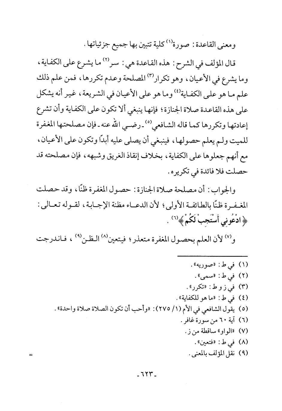 قال المؤلف في الشرح: هذه القاعدة هي: سر (¬2) ما يشرع على الكفاية، وما يشرع في الأعيان، وهو تكرار (¬3) المصلحة وعدم تكررها، فمن علم ذلك علم ما هو على الكفاية (¬4) وما هو على الأعيان في الشريعة، غير أنه يشكل على هذه القاعدة صلاة الجنازة؛ فإنها ينبغي ألا تكون على الكفاية وأن تشرع إعادتها وتكررها كما قاله الشافعي (¬5) - رضي الله عنه - فإن مصلحتها المغفرة للميت ولم يعلم حصولها، فينبغي أن يصلى عليه أبدًا وتكون على الأعيان، مع أنهم جعلوها على الكفاية، بخلاف إنقاذ الغريق وشبهه، فإن مصلحته قد حصلت فلا فائدة في تكريره.