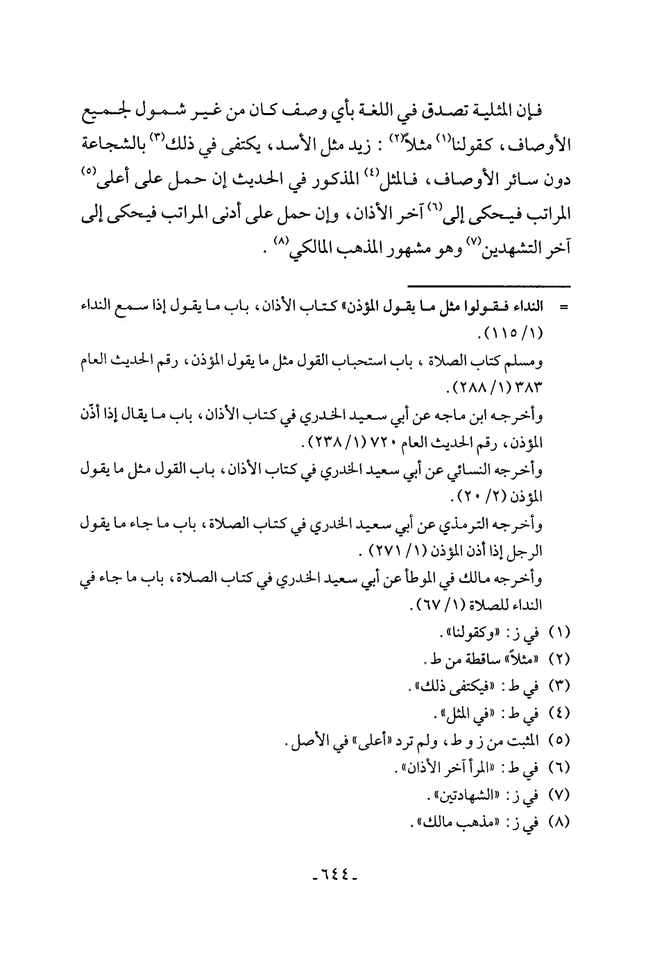 فإن المثلية تصدق في اللغة بأي وصف كان من غير شمول لجميع الأوصاف، كقولنا (¬1) مثلًا (¬2): زيد مثل الأسد، يكتفى في ذلك (¬3) بالشجاعة دون سائر الأوصاف، فالمثل (¬4) المذكور في الحديث إن حمل على أعلى (¬5) المراتب فيحكى إلى (¬6) آخر الأذان، وإن حمل على أدنى المراتب فيحكى إلى آخر التشهدين (¬7) وهو مشهور المذهب المالكي (¬8).