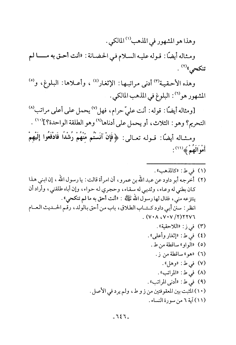 (¬2) أخرجه أبو داود عن عبد الله بن عمرو، أن امرأة قالت: يا رسول الله، إن ابني هذا كان بطني له وعاء، وثديي له سقاء، وحجري له حواء، وإن أباه طلقني، وأراد أن ينتزعه مني، فقال لها رسول الله - صلى الله عليه وسلم -: "أنت أحق به ما لم تنكحي".