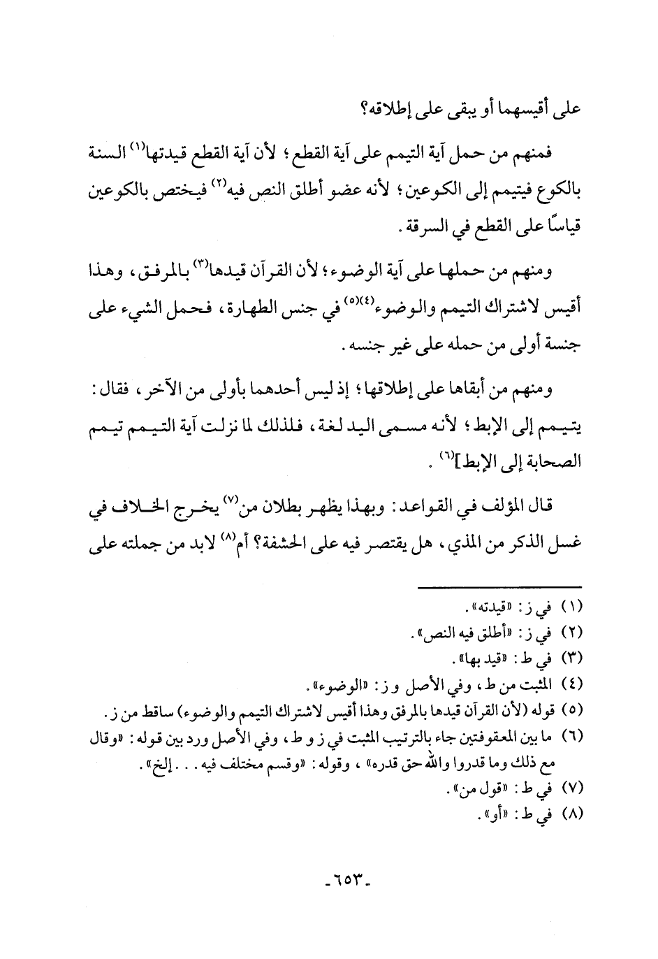 ومنهم من حملها على آية الوضوء؛ لأن القرآن قيدها (¬3) بالمرفق، وهذا أقيس لاشتراك التيمم والوضوء (¬4) (¬5) في جنس الطهارة، فحمل الشيء على جنسة أولى من حمله على غير جنسه.