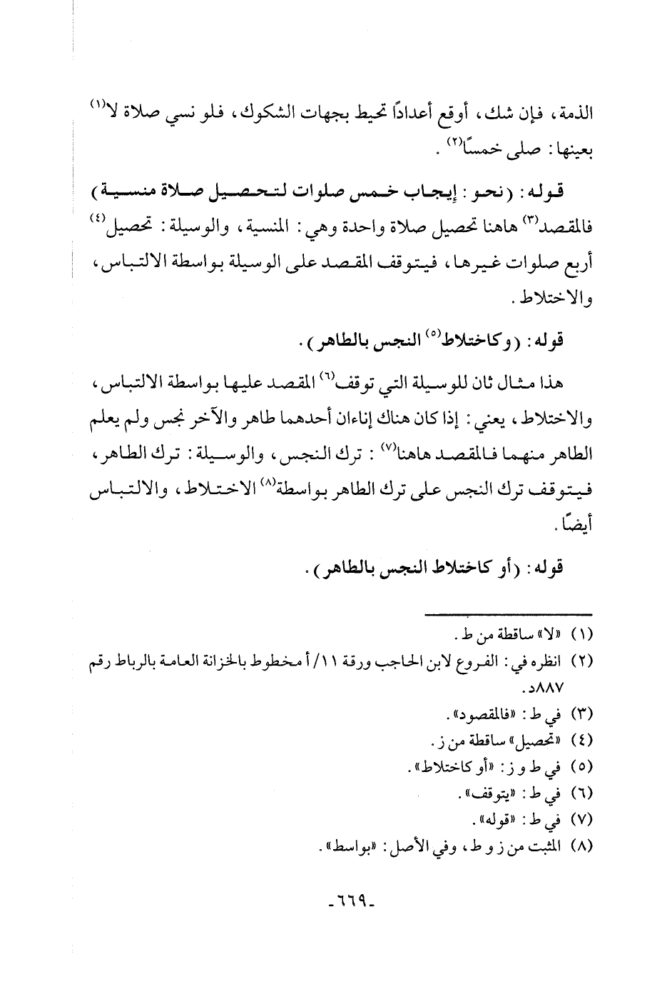 قوله: (نحو: إِيجاب خمس صلوات لتحصيل صلاة منسية) فالمقصد (¬3) ها هنا تحصيل صلاة واحدة وهي: المنسية، والوسيلة: تحصيل (¬4) أربع صلوات غيرها، فيتوقف المقصد على الوسيلة بواسطة الالتباس، والاختلاط.