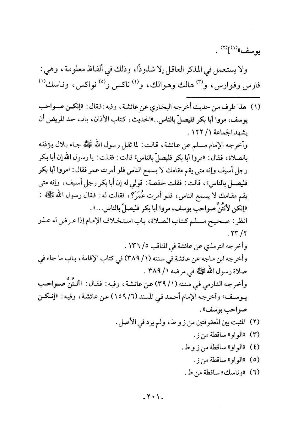 (¬1) هذا طرف من حديث أخرجه البخاري عن عائشة، وفيه: فقال: "إنكن صواحب يوسف، مروا أبا بكر فليصلّ بالناس .. " الحديث، كتاب الأذان، باب حد المريض أن يشهد الجماعة 1/ 122.