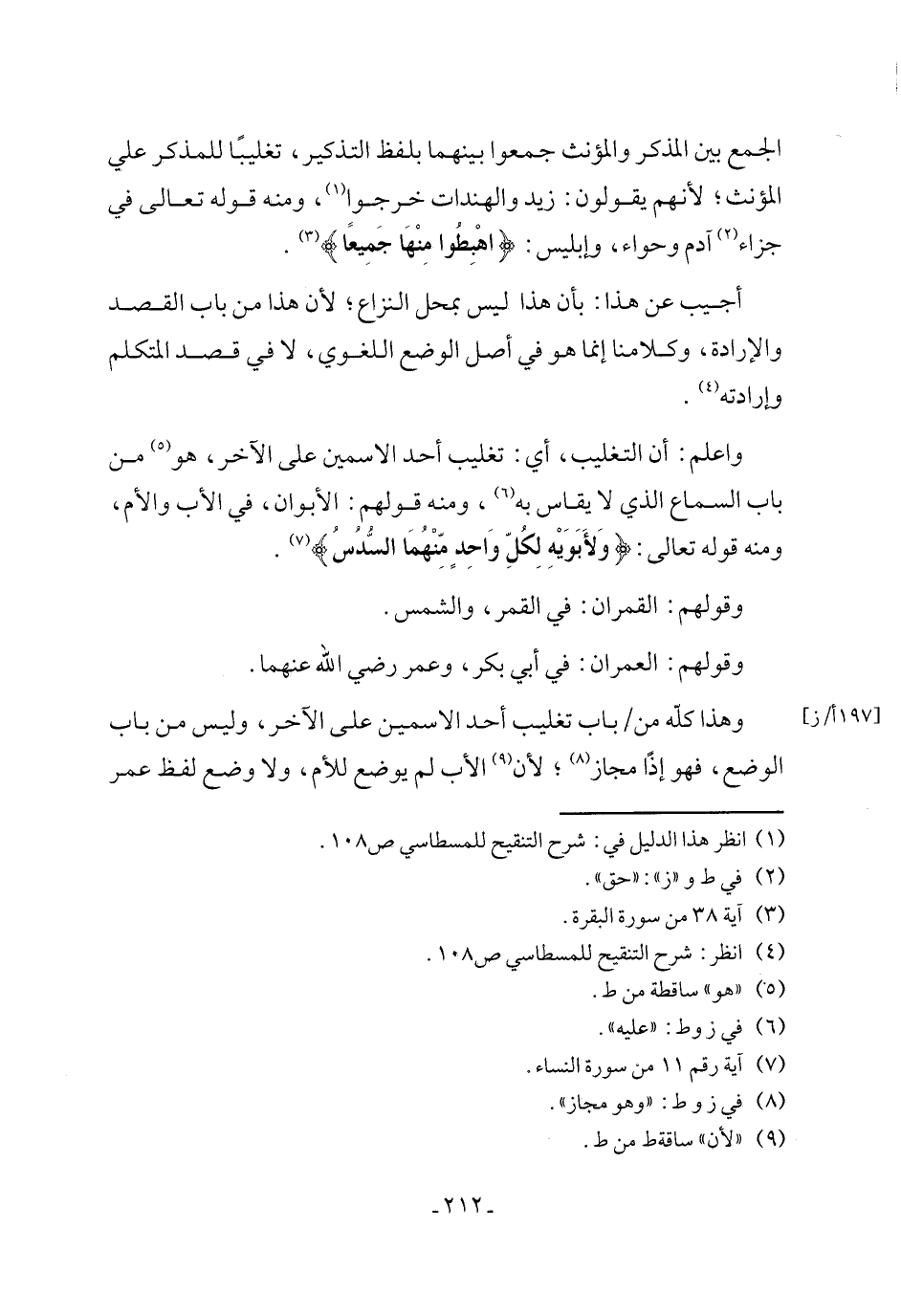واعلم: أن التغليب، أي: تغليب أحد الاسمين على الآخر، هو (¬5) من باب السماع الذي لا يقاس به (¬6)، ومنه قولهم: الأبوان، في الأب والأم، ومنه قوله تعالى: {وَلأَبَوَيْهِ لِكُلِّ وَاحِدٍ مِّنْهُمَا السُّدُس} (¬7).