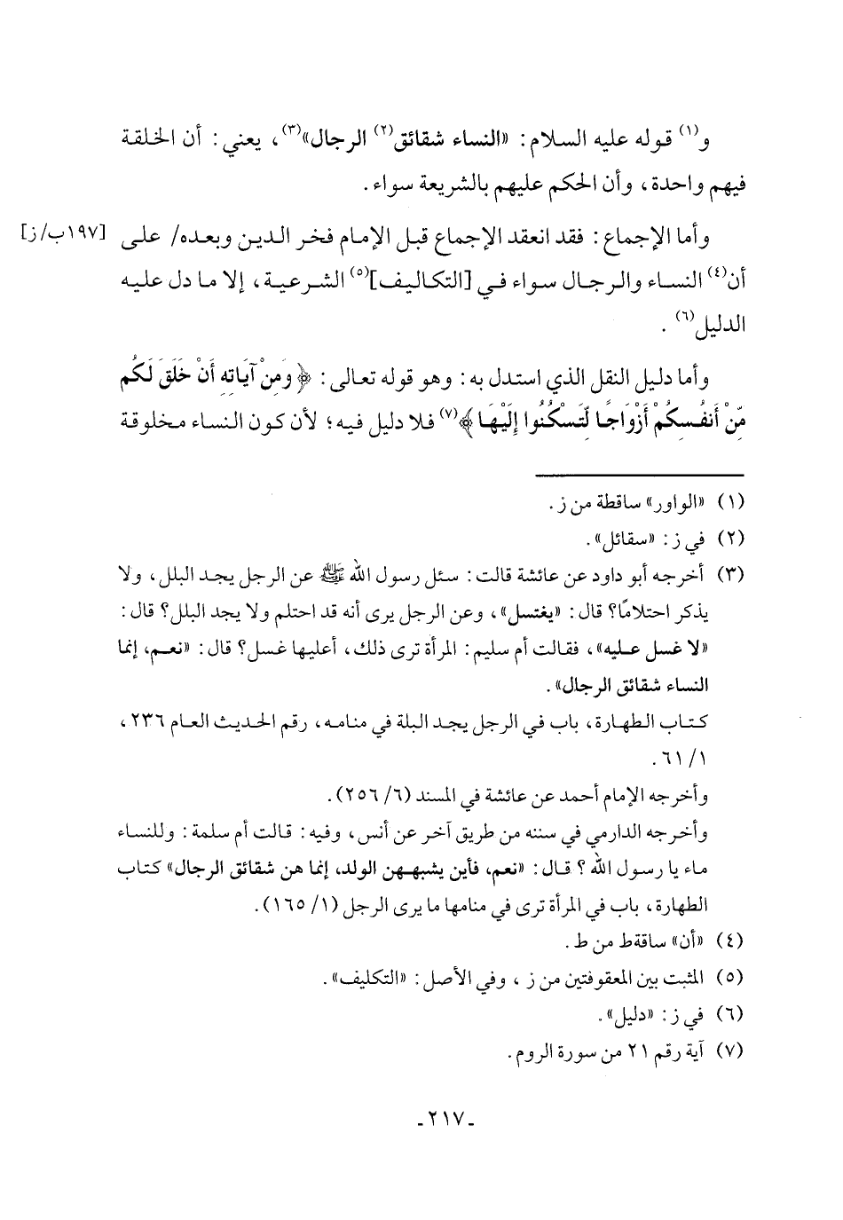 وأما الإجماع: فقد انعقد الإجماع قبل الإمام فخر الدين وبعده على أن (¬4) النساء والرجال سواء في [التكاليف] (¬5) الشرعية، إلا ما دل عليه الدليل (¬6).