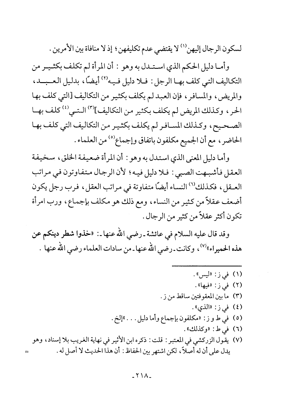وأما دليل الحكم الذي استدل به وهو: أن المرأة لم تكلف بكثير من التكاليف التي كلف بها الرجل: فلا دليل فيه (¬2) أيضًا، بدليل العبد، والمريض، والمسافر، فإن العبد لم يكلف بكثير من التكاليف [التي كلف بها الحر، وكذلك المريض لم يكلف بكثير من التكاليف] (¬3) التي (¬4) كلف بها الصحيح، وكذلك المسافر لم يكلف بكثير من التكاليف التي كلف بها الحاضر، مع أن الجميع مكلفون باتفاق وإجماع (¬5) من العلماء.