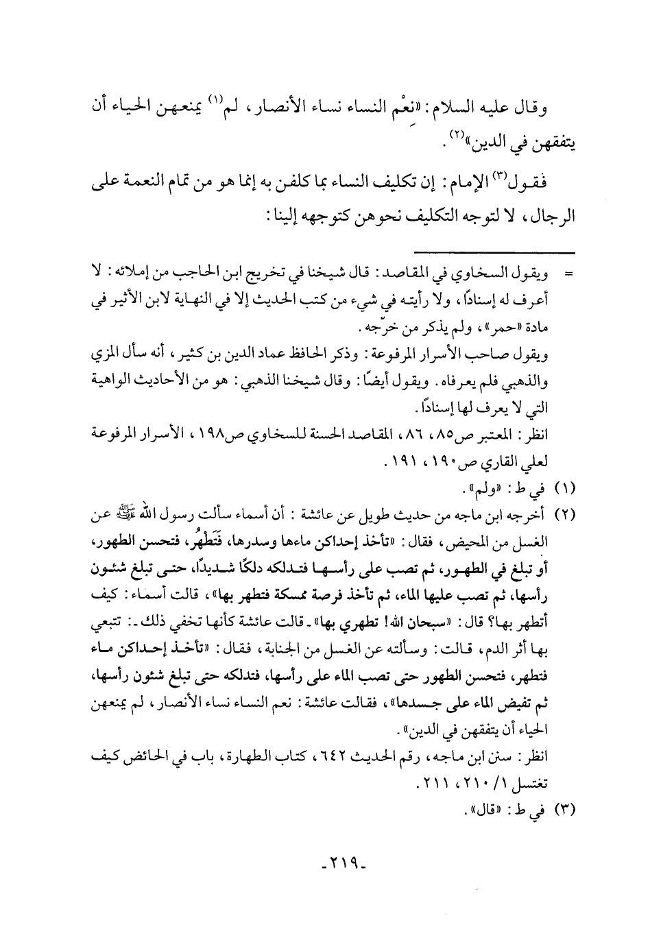 (¬2) أخرجه ابن ماجه من حديث طويل عن عائشة: أن أسماء سألت رسول الله - صلى الله عليه وسلم - عن الغسل من المحيض، فقال: "تأخذ إحداكن ماءها وسدرها، فَتَطْهُر، فتحسن الطهور، أو تبلغ في الطهور، ثم تصب على رأسها فتدلكه دلكًا شديدًا، حثى تبلغ شئون رأسها، ثم تصب عليها الماء، ثم تأخذ فرصة ممسكة فتطهر بها"، قالت أسماء: كيف أتطهر بها؟ قال: "سبحان الله! تطهري بها" - قالت عائشة كأنها تخفي ذلك -: تتبعي بها أثر الدم، قالت: وسألته عن الغسل من الجنابة، فقال: "تأخذ إحداكن ماء فتطهر، فتحسن الطهور حتى تصب الماء على رأسها، فتدلكه حتى تبلغ شئون رأسها، ثم تفيض الماء على جسدها"، فقالت عائشة: نعم النساء نساء الأنصار، لم يمنعهن الحياء أن يتفقهن في الدين".