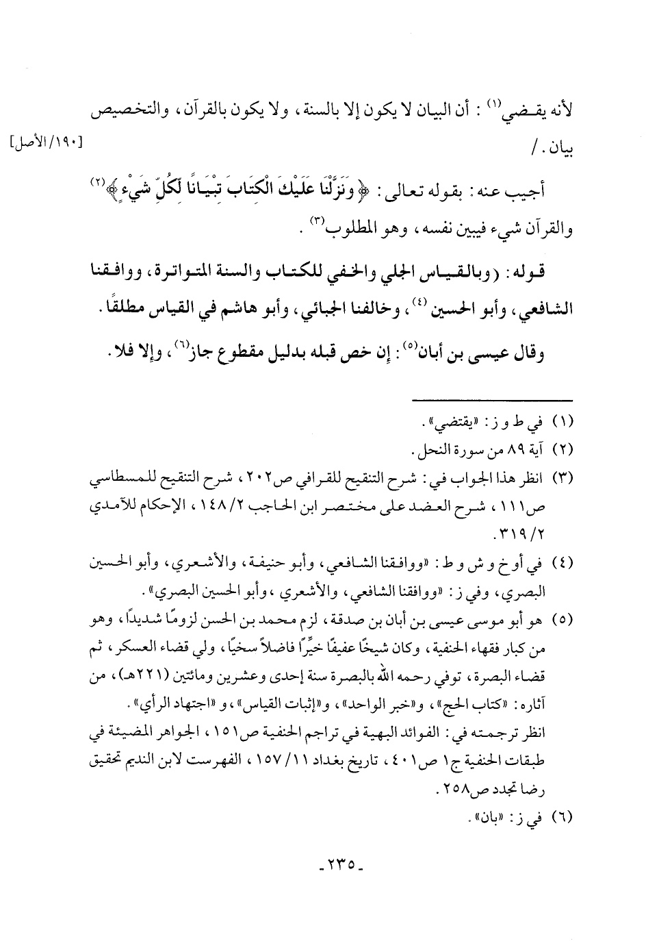 (¬5) هو أبو موسى عيسى بن أبان بن صدقة، لزم محمد بن الحسن لزومًا شديدًا، وهو من كبار فقهاء الحنفية، وكان شيخًا عفيفًا خيِّرًا فاضلاً سخيًا، ولي قضاء العسكر، ثم قضاء البصرة، توفي رحمه الله بالبصرة سنة إحدى وعشرين ومائتين (221 هـ)، من آثاره: "كتاب الحج"، و"خبر الواحد"، و"إثبات القياس"، و"اجتهاد الرأي".