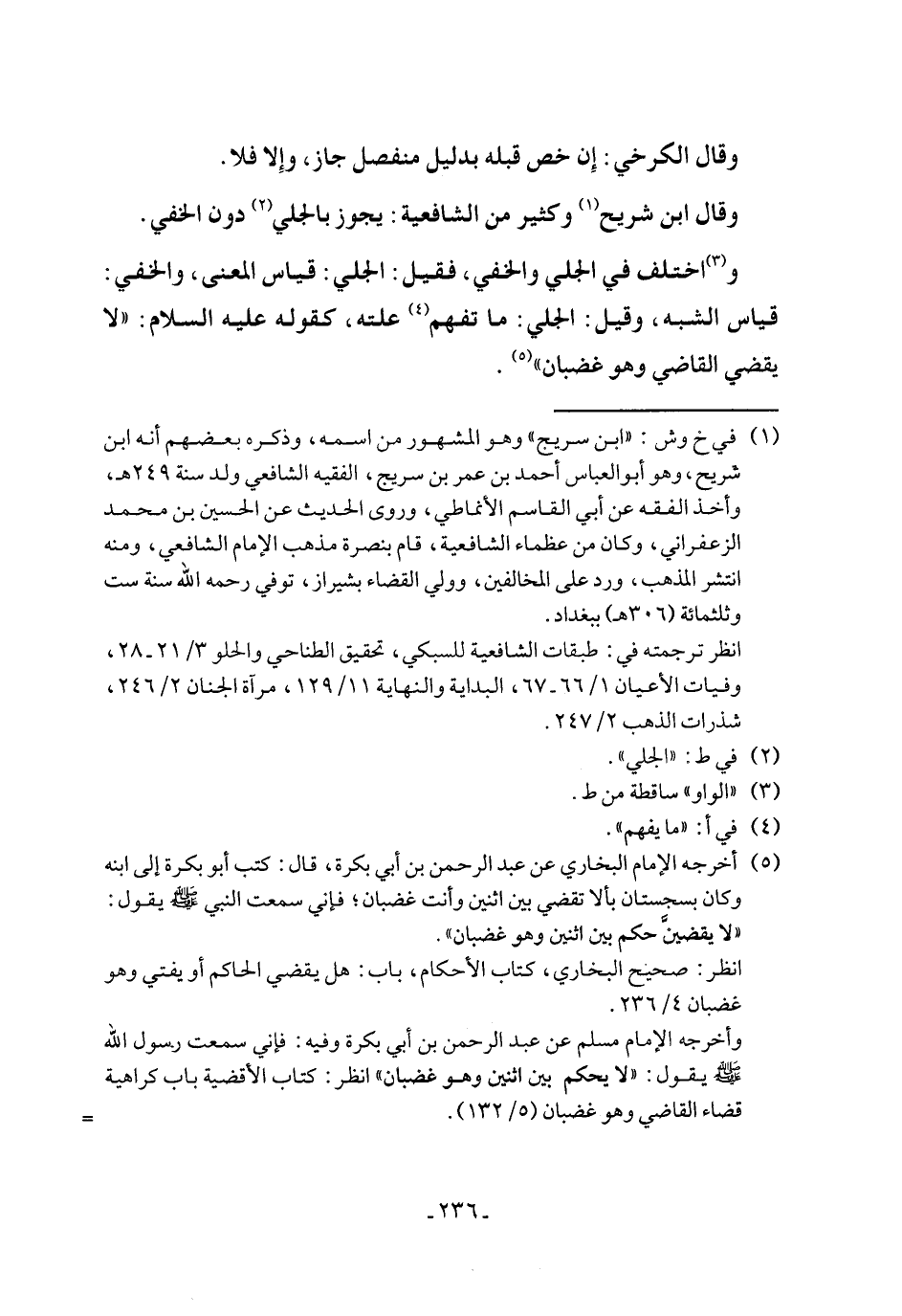(¬1) في خ وش: "ابن سريج" وهو المشهور من اسمه، وذكره بعضهم أنه ابن شريح، وهو أبو العباس أحمد بن عمر بن سريج، الفقيه الشافعي ولد سنة 249 هـ، وأخذ الفقه عن أبي القاسم الأنماطي، وروى الحديث عن الحسين بن محمد الزعفراني، وكان من عظماء الشافعية، قام بنصرة مذهب الإمام الشافعي، ومنه انتشر المذهب، ورد على المخالفين، وولي القضاء بشيراز، توفي رحمه الله سنة ست وثلثمائة (306 هـ) ببغداد.