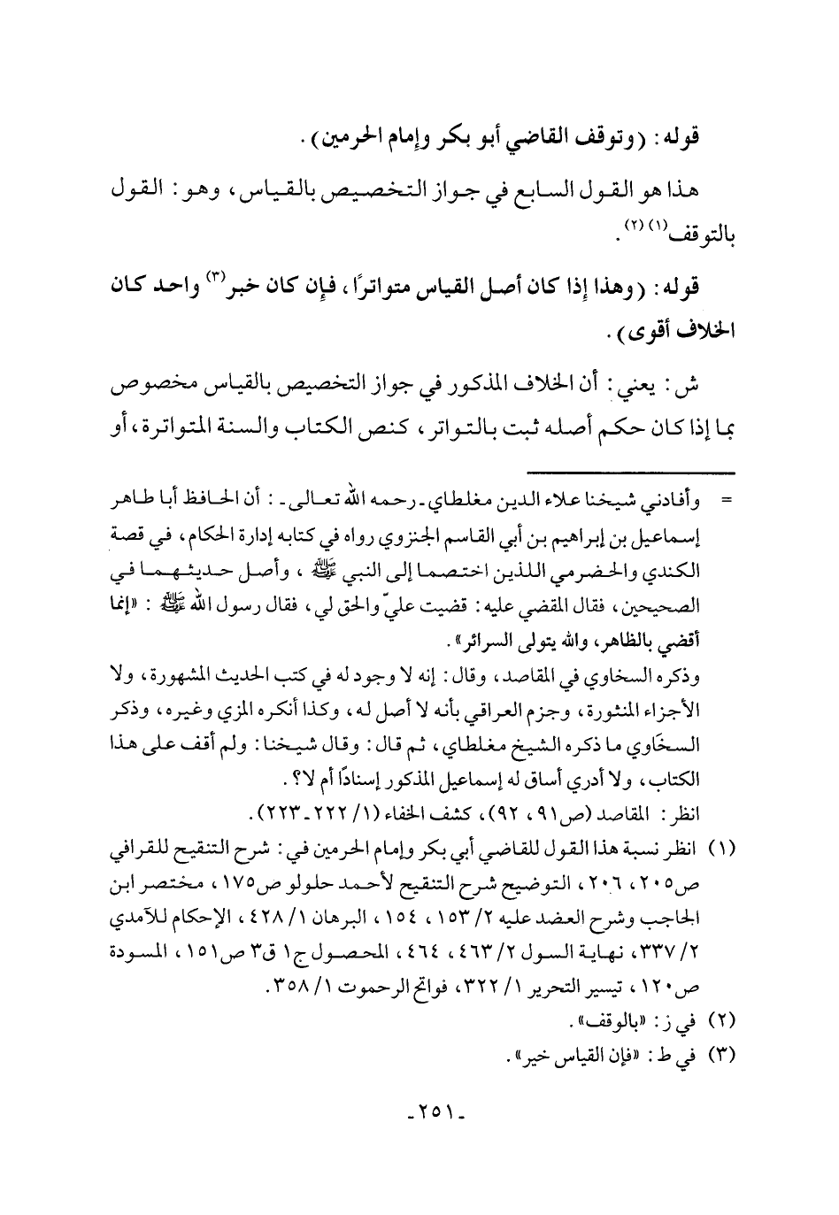 (¬1) انظر نسبة هذا القول للقاضي أبي بكر وإمام الحرمين في: شرح التنقيح للقرافي ص 205، 206، التوضيح شرح التنقيح لأحمد حلولو ص 175، مختصر ابن الحاجب وشرح العضد عليه 2/ 153، 154، البرهان 1/ 428، الإحكام للآمدي 2/ 337، نهاية السول 2/ 463, 464، المحصول ج 1 ق 3 ص 151، المسودة ص 120، تيسير التحرير 1/ 322، فواتح الرحموت 1/ 358.