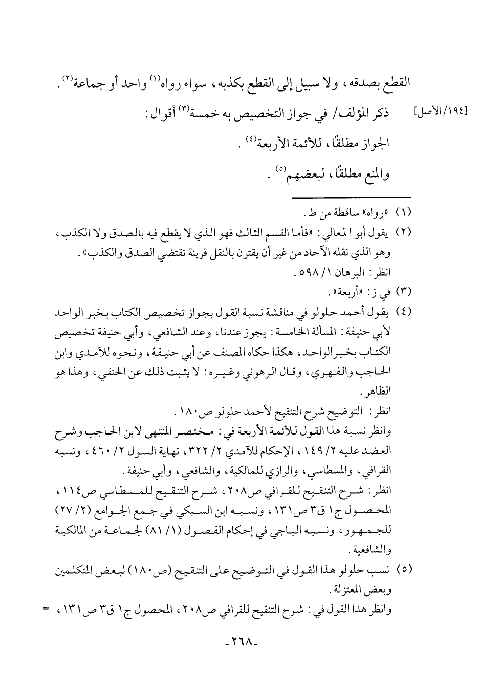 (¬4) يقول أحمد حلولو في مناقشة نسبة القول بجواز تخصيص الكتاب بخبر الواحد لأبي حنيفة: المسألة الخامسة: يجوز عندنا، وعند الشافعي، وأبي حنيفة تخصيص الكتاب بخبر الواحد، هكذا حكاه المصنف عن أبي حنيفة، ونحوه للآمدي وابن الحاجب والفهري، وقال الرهوني وغيره: لا يثبت ذلك عن الحنفي، وهذا هو الظاهر.
