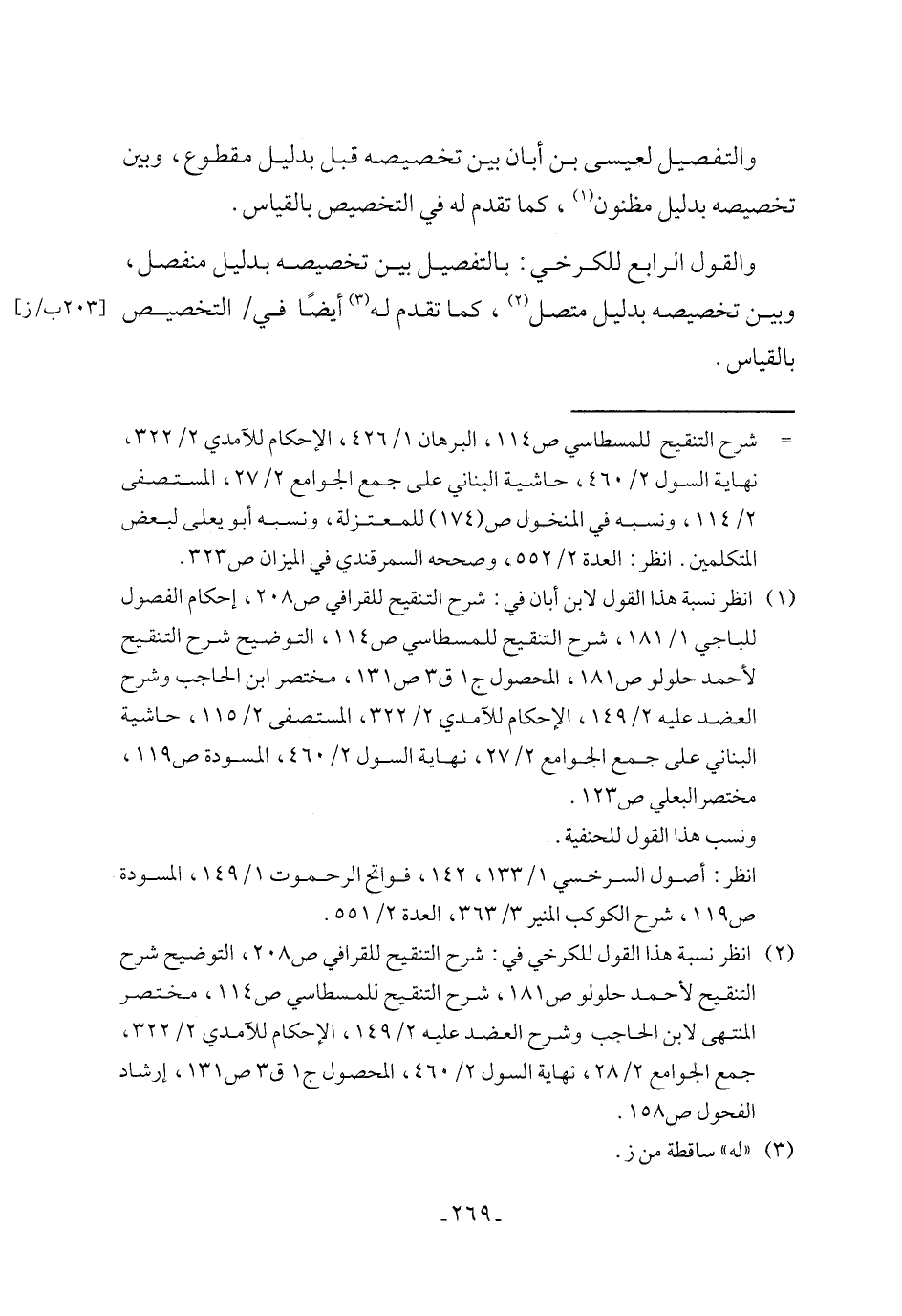 (¬2) انظر نسبة هذا القول للكرخي في: شرح التنقيح للقرافي ص 208، التوضيح شرح التنقيح لأحمد حلولو ص 181، شرح التنقيح للمسطاسي ص 114، مختصر المنتهى لابن الحاجب وشرح االعضد عليه 2/ 149، الإحكام للآمدي 2/ 322, جمع الجوامع 2/ 28, نهاية السول 2/ 460، المحصول ج 1 ق 3 ص 131، إرشاد الفحول ص 158.