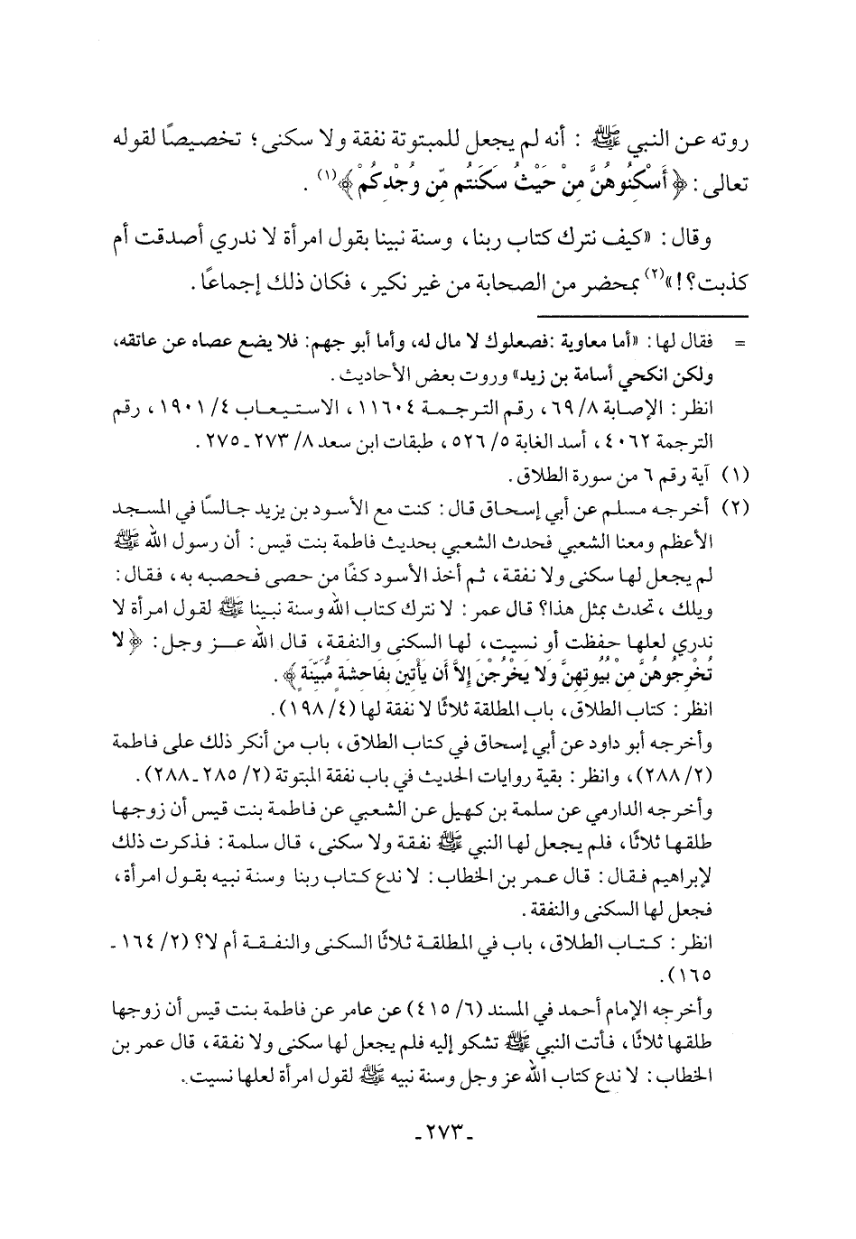 (¬2) أخرجه مسلم عن أبي إسحاق قال: كنت مع الأسود بن يزيد جالسًا في المسجد الأعظم ومعنا الشعبي فحدث الشعبي بحديث فاطمة بنت قيس: أن رسول الله - صلى الله عليه وسلم - لم يجعل لها سكنى ولا نفقة، ثم أخذ الأسود كفًا من حصى فحصبه به، فقال: ويلك، تحدث بمثل هذا؟ قال عمر: لا نترك كتاب الله وسنة نبينا - صلى الله عليه وسلم - لقول امرأة لا ندري لعلها حفظت أو نسيت، لها السكنى والنفقة، قال الله عز وجل: {لا تُخْرِجُوهن منْ بُيُوتِهِنَّ وَلا يخْرُجْنَ إِلأَ أَن يأتين بفَاحشَةِ مّبَيِّنَةٍ}.