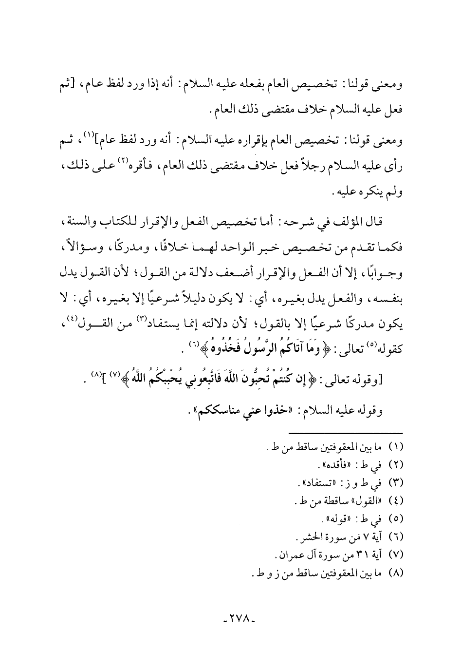ومعنى قولنا: تخصيص العام بإقراره عليه السلام: أنه ورد لفظ عام] (¬1)، ثم رأى عليه السلام رجلاً فعل خلاف مقتضى ذلك العام، فأقره (¬2) على ذلك، ولم ينكره عليه.