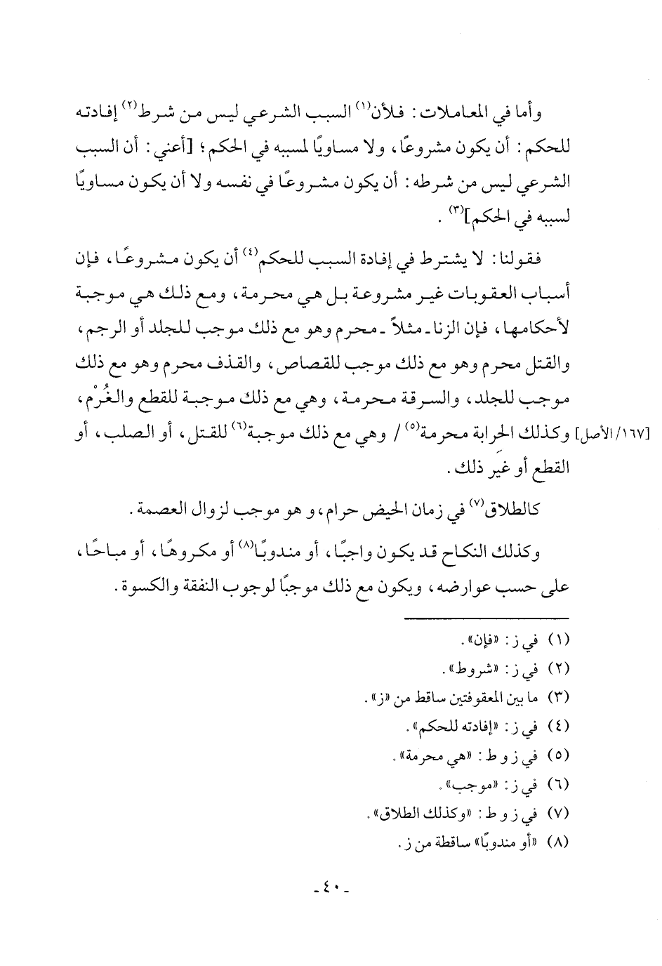 فقولنا: لا يشترط في إفادة السبب للحكم (¬4) أن يكون مشروعًا، فإن أسباب العقوبات غير مشروعة بل هي محرمة، ومع ذلك هي موجبة لأحكامها، فإن الزنا - مثلاً - محرم وهو مع ذلك موجب للجلد أو الرجم، والقتل محرم وهو مع ذلك موجب للقصاص، والقذف محرم وهو مع ذلك موجب للجلد، والسرقة محرمة، وهي مع ذلك موجبة للقطع والغُرْم، وكذلك الحرابة محرمة (¬5) وهي مع ذلك موجبة (¬6) للقتل، أو الصلب، أو القطع أو غير ذلك.