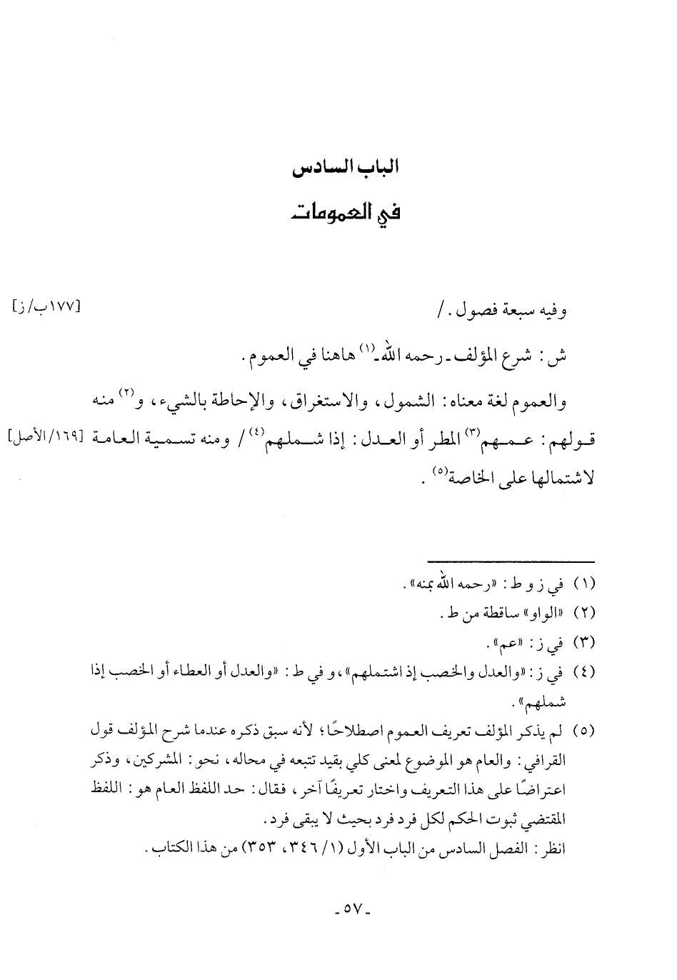 (¬5) لم يذكر المؤلف تعريف العموم اصطلاحًا؛ لأنه سبق ذكره عندما شرح المؤلف قول القرافي: والعام هو الموضوع لمعنى كلي بقيد تتبعه في محاله، نحو: المشركين، وذكر اعتراضًا علي هذا التعريف واختار تعريفًا آخر، فقال: حد اللفظ العام هو: اللفظ المقتضي ثبوت الحكم لكل فرد فرد بحيث لا يبقى فرد.