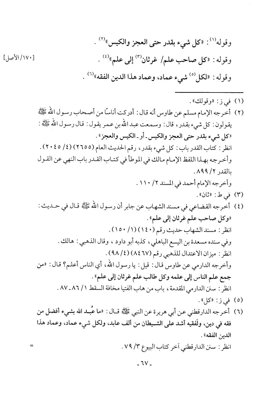(¬6) أخرجه الدارقطني عن أبي هريرة عن النبي - صلى الله عليه وسلم - قال: "ما عُبد الله بشيء أفضل من فقه في دين، ولَفقيه أشد على الشيطان من ألف عابد، ولكل شيء عماد، وعماد هذا الدين الفقه".