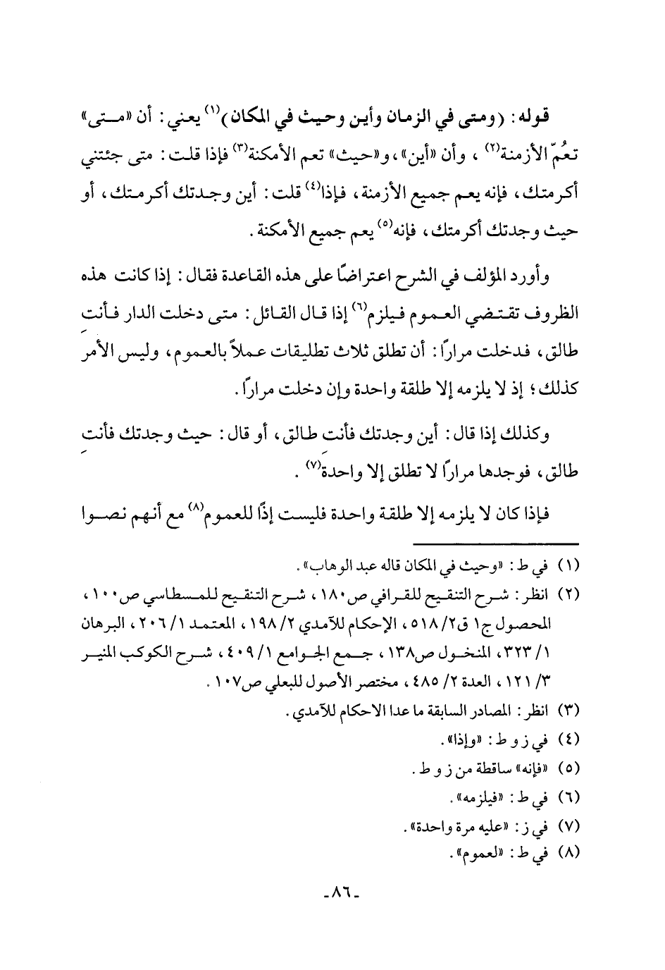 وأورد المؤلف في الشرح اعتراضًا على هذه القاعدة فقال: إذا كانت هذه الظروف تقتضي العموم فيلزم (¬6) إذا قال القائل: متى دخلت الدار فأنتِ طالق، فدخلت مرارًا: أن تطلق ثلاث تطليقات عملاً بالعموم، وليس الأمر كذلك؛ إذ لا يلزمه إلا طلقة واحدة وإن دخلت مرارًا.