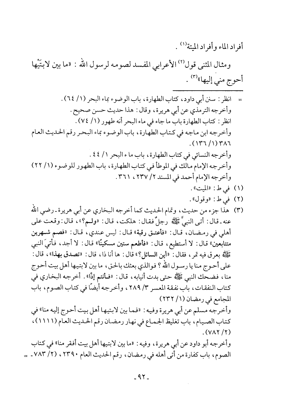 ومثال المثنى قول (¬2) الأعرابي المفسد لصومه لرسول الله: "ما بين لابتَيْها أحوج مني إليها" (¬3).