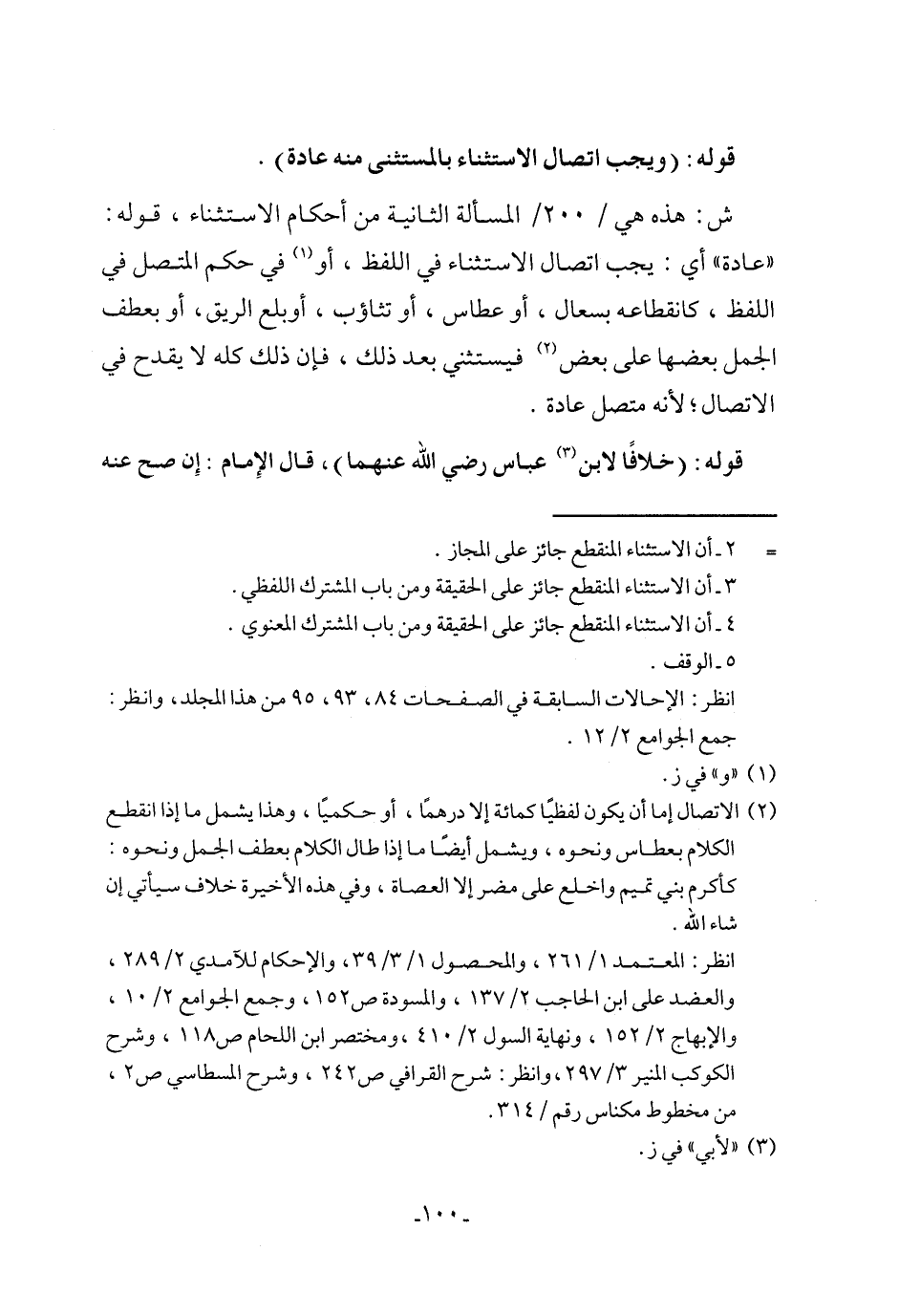 ش: هذه هي/ 200/ المسألة الثانية من أحكام الاستثناء، قوله: "عادة" أي: يجب اتصال الاستثناء في اللفظ، أو (¬1) في حكم المتصل في اللفظ، كانقطاعه بسعال، أو عطاس، أو تثاؤب، أو بلع الريق، أو بعطف الجمل بعضها على بعض (¬2) فيستثني بعد ذلك، فإن ذلك كله لا يقدح في الاتصال؛ لأنه متصل عادة.