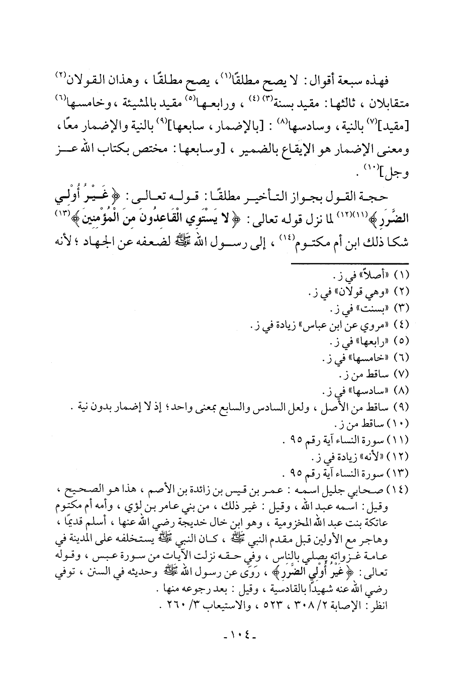 حجة القول بجواز التأخير مطلقًا: قوله تعالى: {غَيْرُ أُوْلي الضَّرَرِ} (¬11) (¬12) لما نزل قوله تعالى: {لا يَسْتَوِي الْقَاعِدُونَ مِنَ الْمُؤْمِنِين} (¬13) شكا ذلك ابن أم مكتوم (¬14)، إلى رسول الله - صلى الله عليه وسلم - لضعفه عن الجهاد؛ لأنه