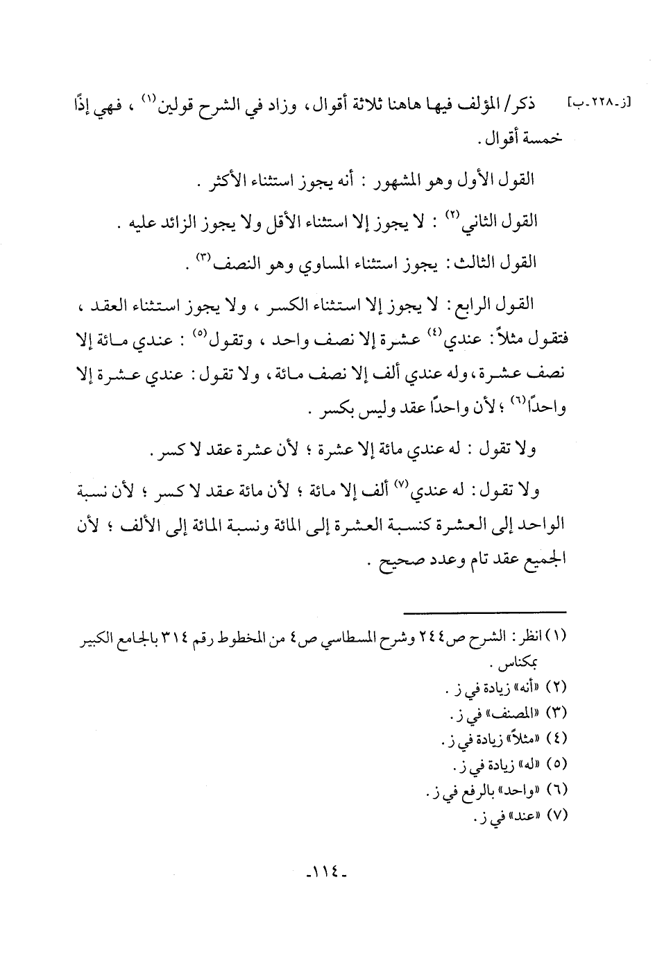 القول الرابع: لا يجوز إلا استثناء الكسر، ولا يجوز استثناء العقد، فتقول مثلًا: عندي (¬4) عشرة إلا نصف واحد، وتقول (¬5): عندي مائة إلا نصف عشرة، وله عندي ألف إلا نصف مائة، ولا تقول: عندي عشرة إلا واحدًا (¬6)؛ لأن واحدًا عقد وليس بكسر.