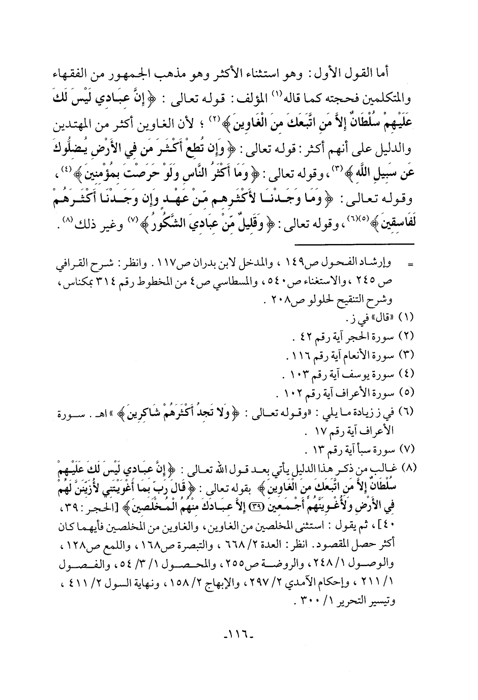أما القول الأول: وهو استثناء الأكثر وهو مذهب الجمهور من الفقهاء والمتكلمين فحجته كما قاله (¬1) المؤلف: قوله تعالى: {إِنَّ عِبَادِي لَيْسَ لَكَ عَلَيْهِمْ سُلْطَانٌ إلا مَنِ اتَّبَعَكَ مِنَ الْغَاوِينَ} (¬2)، لأن الغاوين أكثر من المهتدين والدليل على أنهم أكثر: قوله تعالى: {وَإِن تُطِعْ أَكْثَرَ مَن فِي الأَرْضِ يُضِلُّوكَ عَن سَبِيلِ اللهِ} (¬3)، وقوله تعالى: {وَمَا أَكثَرُ النَّاسِ وَلَوْ حَرَصْتَ بِمُؤْمِنِينَ} (¬4)، وقوله تعالى: {وَمَا وَجَدْنَا لأَكثَرِهِم مِّنْ عَهْدٍ وَإِن وَجَدْنَا أَكْثَرَهُمْ لَفَاسِقِينَ} (¬5) (¬6)، وقوله تعالى: {وَقَلِيلٌ منْ عِبَادِيَ الشَّكُورُ} (¬7) وغير ذلك (¬8).