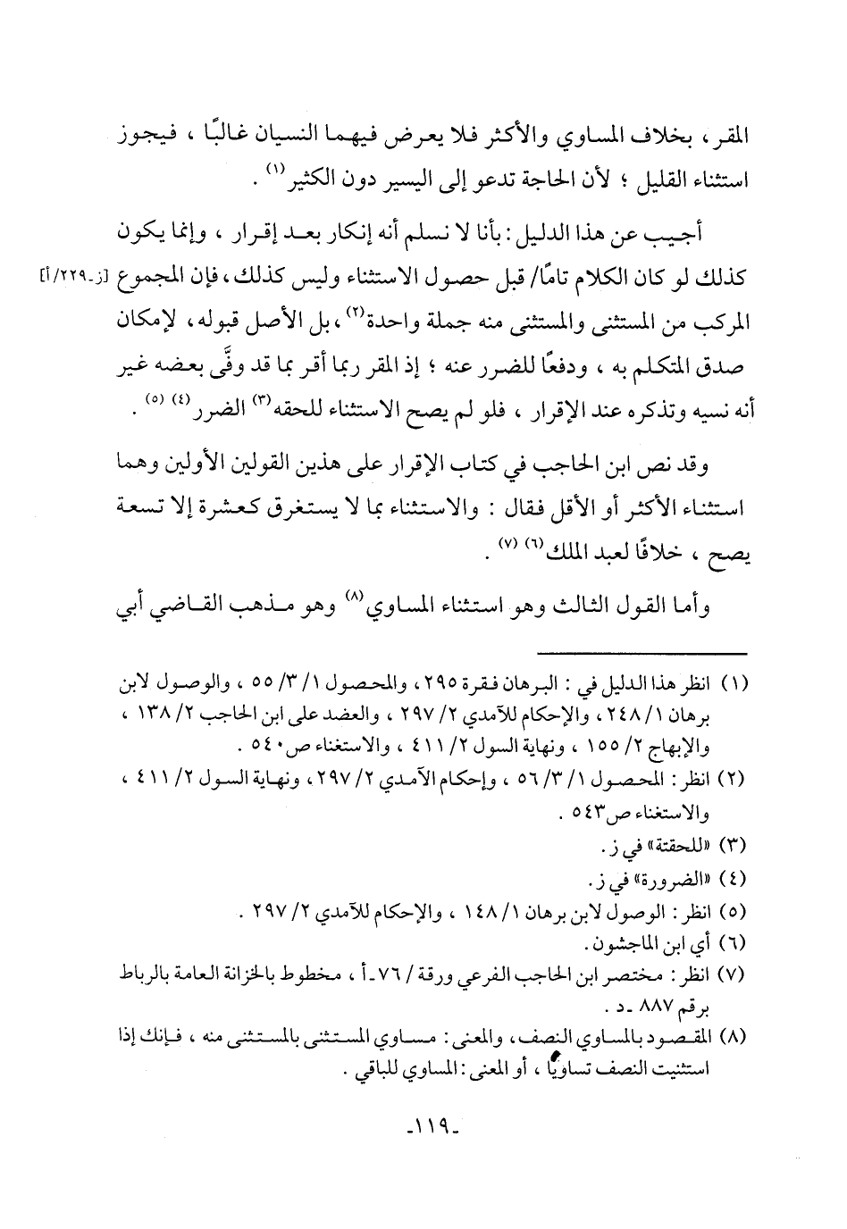 (¬8) المقصود بالمساوي النصف، والمعنى: مساوي المستثنى بالمستثنى منه، فإنك إذا استثنيت النصف تساويا، أو المعنى: المساوي للباقي.