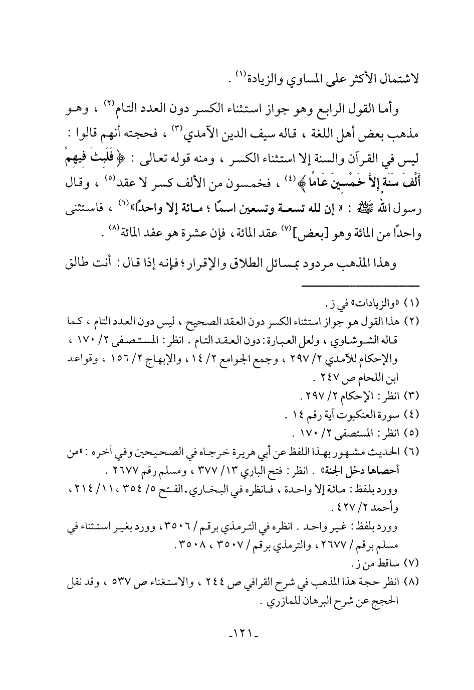 وأما القول الرابع وهو جواز استثناء الكسر دون العدد التام (¬2)، وهو مذهب بعض أهل اللغة، قاله سيف الدين الآمدي (¬3)، فحجته أنهم قالوا: ليس في القرآن والسنة إلا استثناء الكسر، ومنه قوله تعالى: {فَلَبِثَ فِيهِمْ أَلْفَ سَنَةٍ إلا خَمْسِينَ عَامًا} (¬4)، فخمسون من الألف كسر لا عقد (¬5)، وقال رسول الله - صلى الله عليه وسلم -: "إن لله تسعة وتسعين اسمًا؛ مائة إلا واحدًا" (¬6)، فاستثنى واحدًا من المائة وهو [بعض] (¬7) عقد المائة، فإن عشرة هو عقد المائة (¬8).