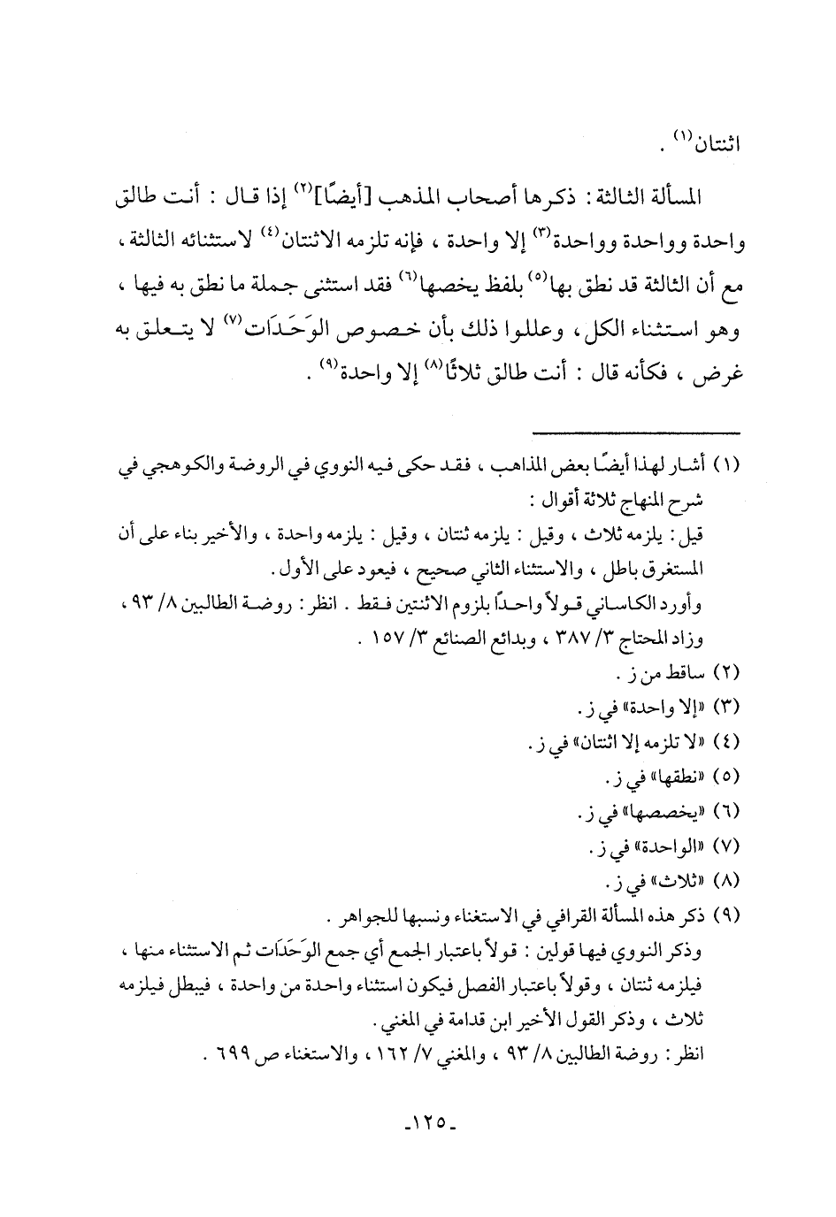 وذكر النووي فيها قولين: قولًا باعتبار الجمع أي جمع الوَحَدَات ثم الاستثناء منها، فيلزمه ثنتان، وقولًا باعتبار الفصل فيكون استثناء واحدة من واحدة، فيبطل فيلزمه ثلاث، وذكر القول الأخير ابن قدامة في المغني.